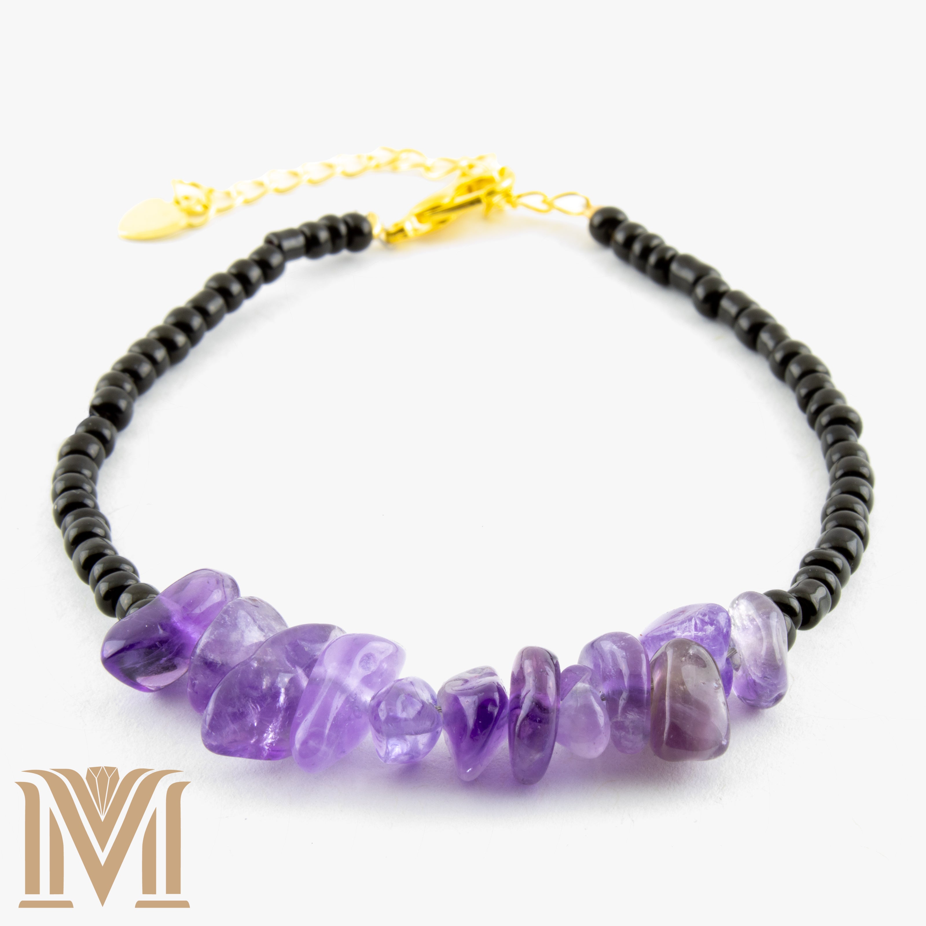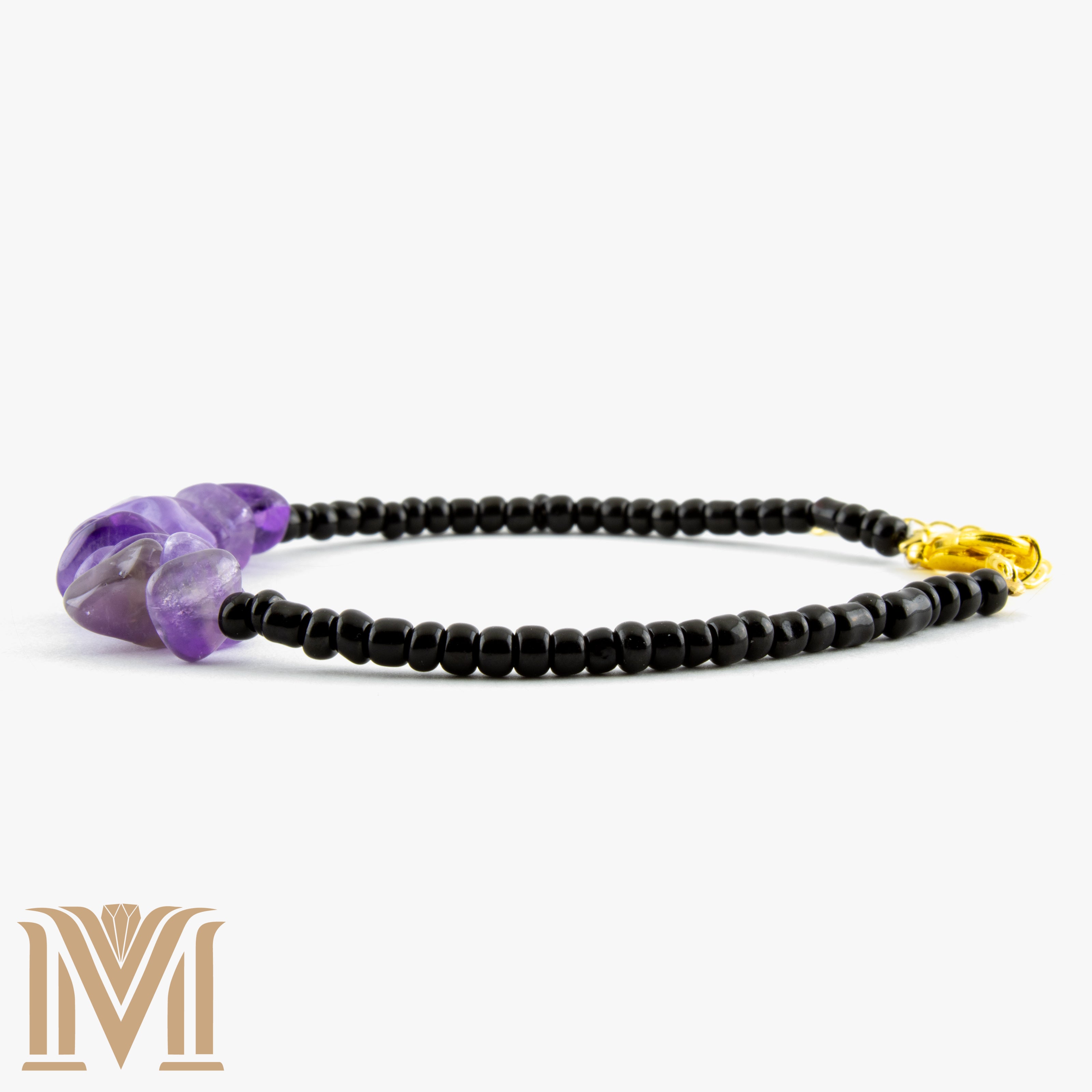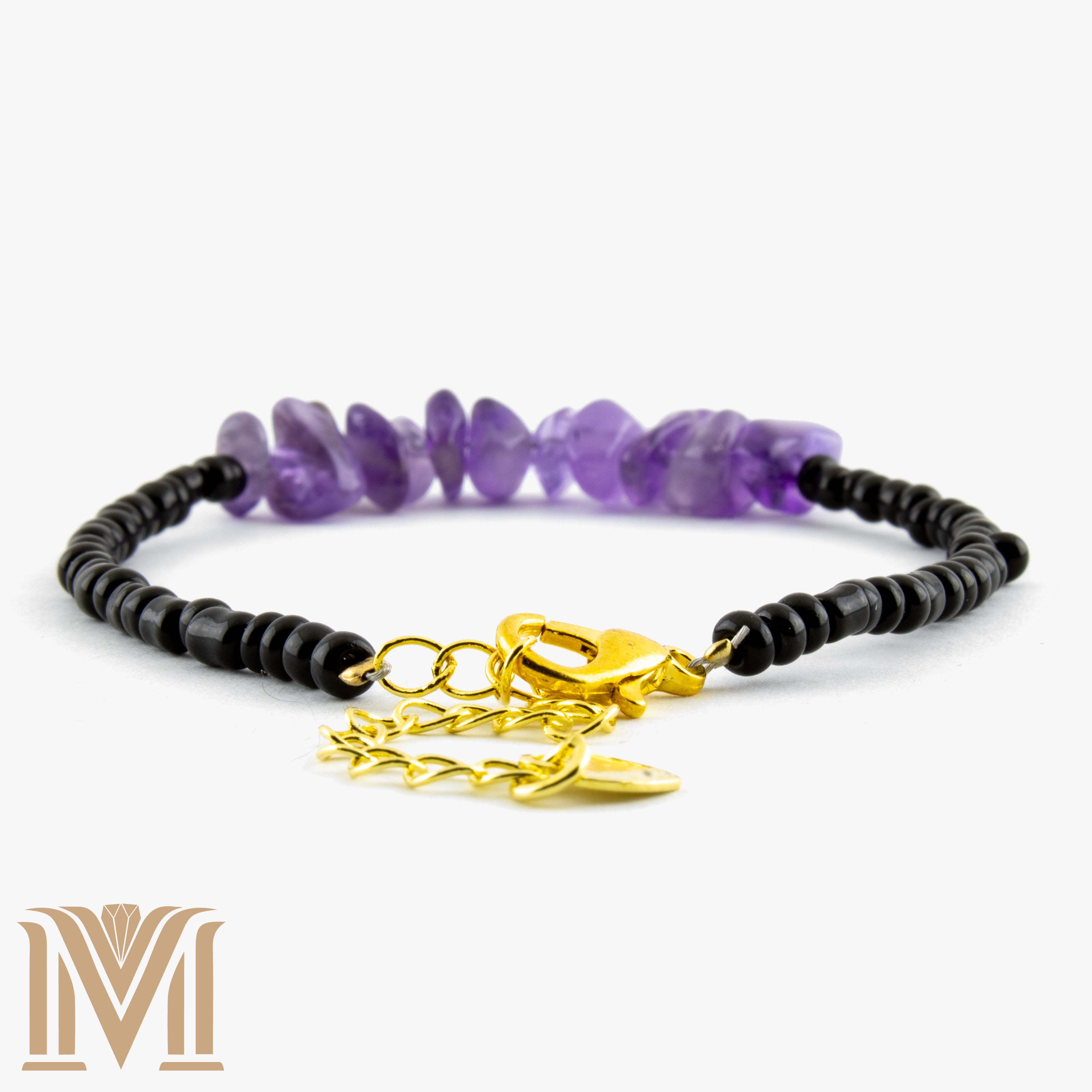Channel elegance and intuition with the Violet Muse bracelet — a handmade piece featuring raw amethyst chip beads strung between jet black seed beads and finished with a stainless steel gold-colored adjustable chain. Each amethyst stone is uniquely shaped and polished to enhance its natural beauty, adding a raw yet refined charm to this eye-catching design.