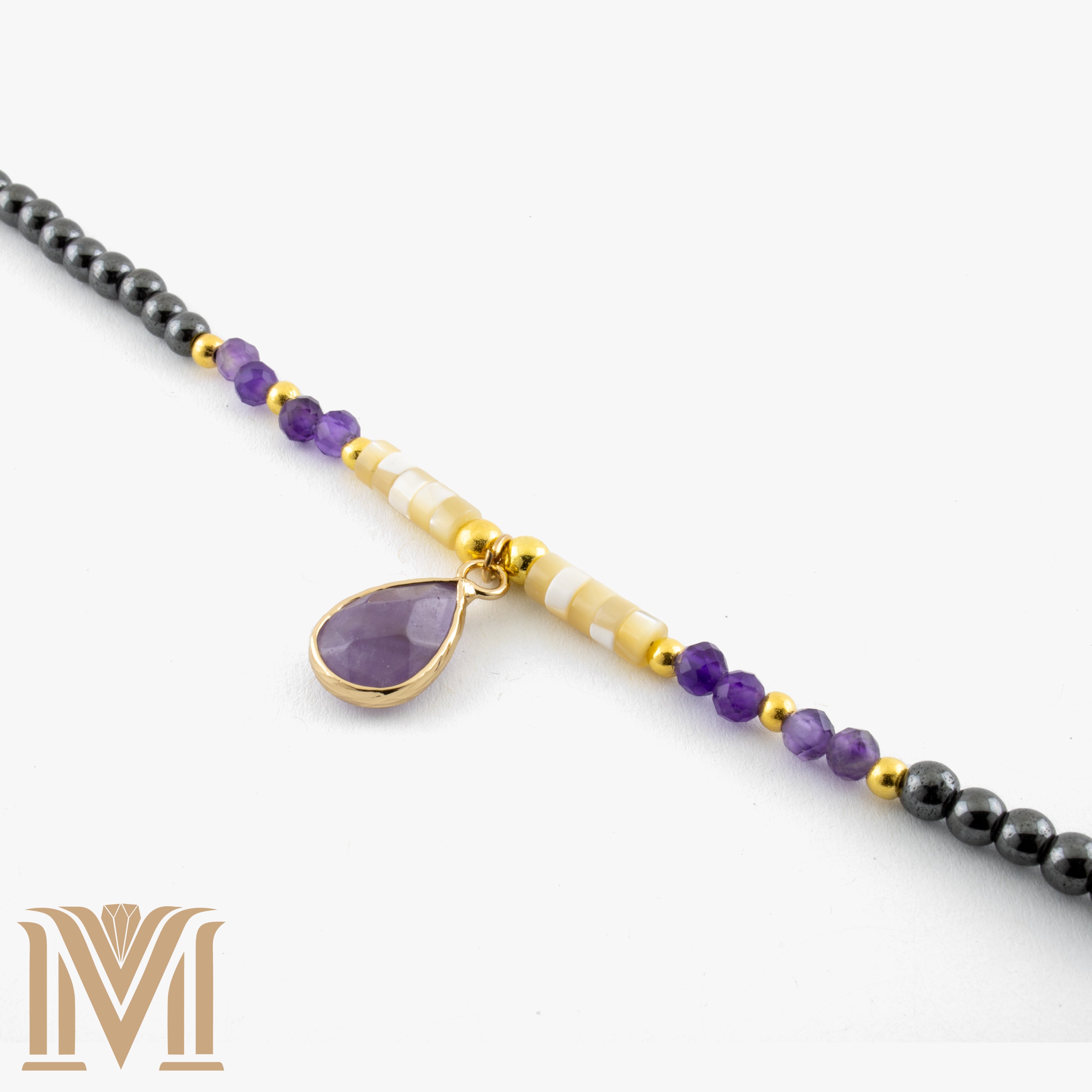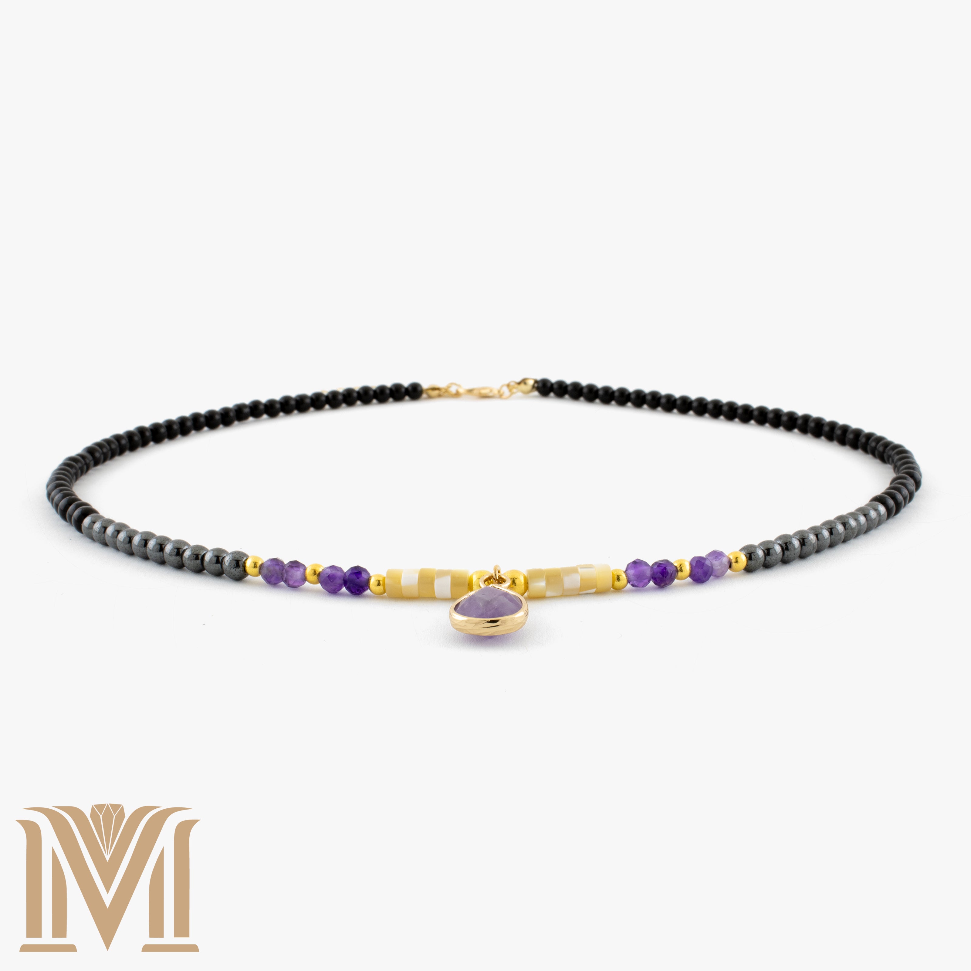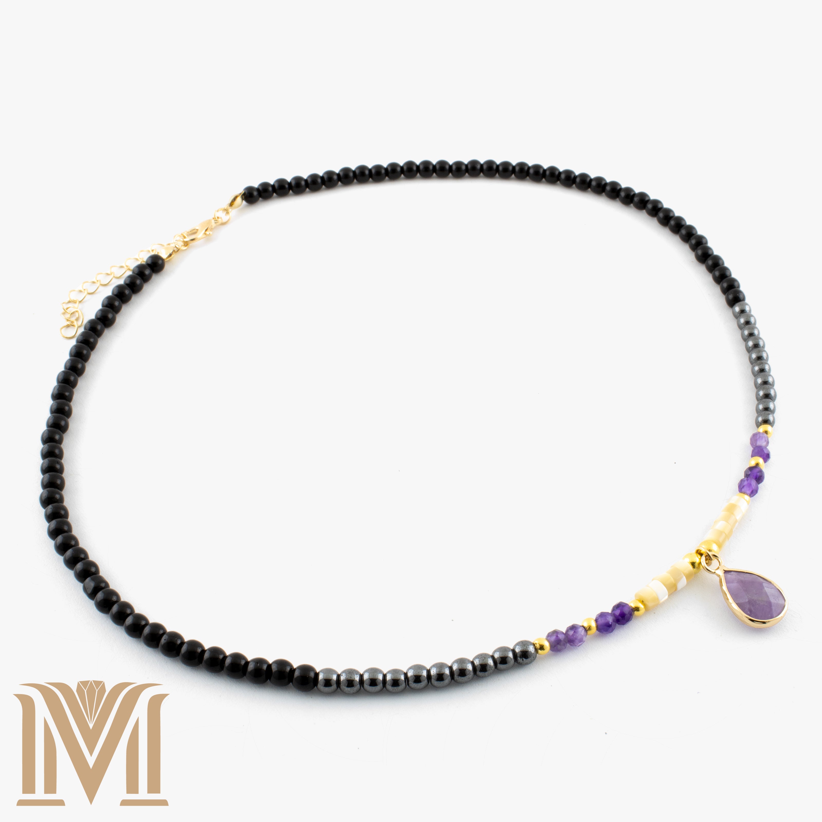 Elevate your elegance with Twilight Teardrop, a radiant choker necklace crafted to captivate. This handmade piece features the mesmerizing purple hue of amethyst, harmonized with grounding black onyx, magnetic hematite, and creamy heishi seashell beads. Centered with a faceted amethyst teardrop pendant, encased in warm stainless steel gold-tone plating, this necklace evokes the magic of twilight skies.