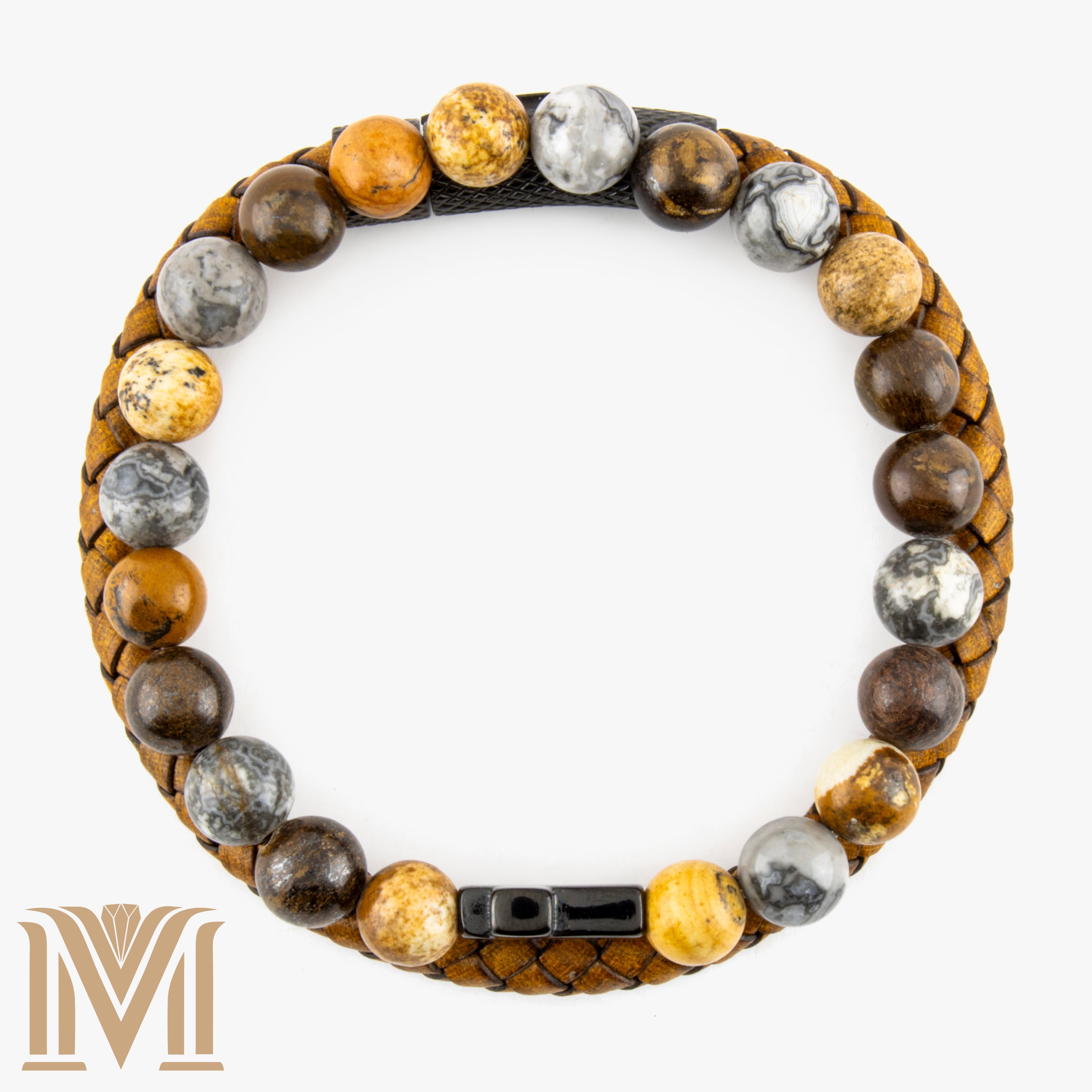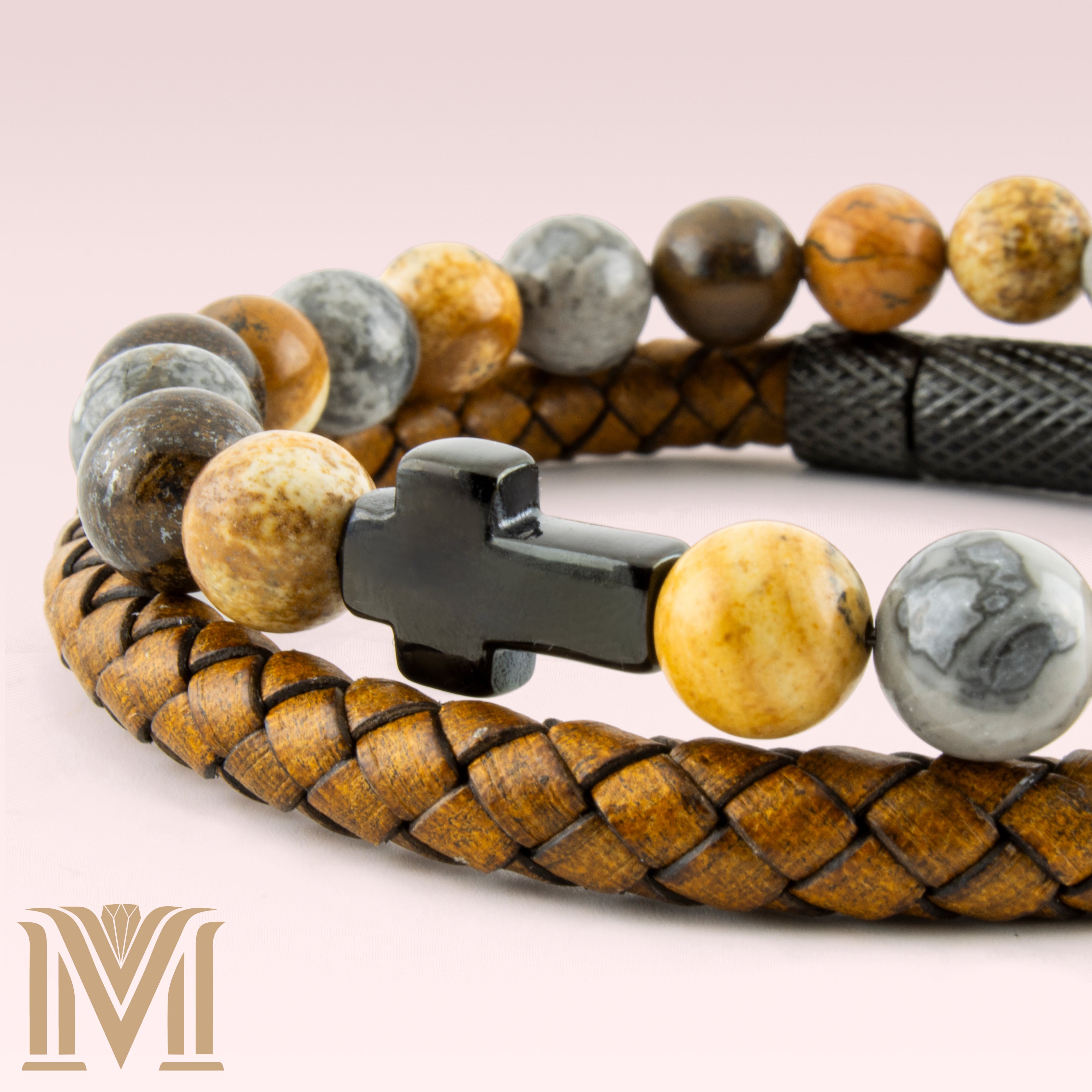 Root yourself in style and meaning with Earthbound Grace, a two-piece unisex bracelet set that pairs grounded elegance with spiritual symbolism. This artisan-crafted duo includes a rugged, woven brown leather band with a sleek magnetic clasp and a complementary elastic gemstone bracelet made from Bronzite, Map Stone, and Picture Jasper, centered by a glossy black hematite cross.