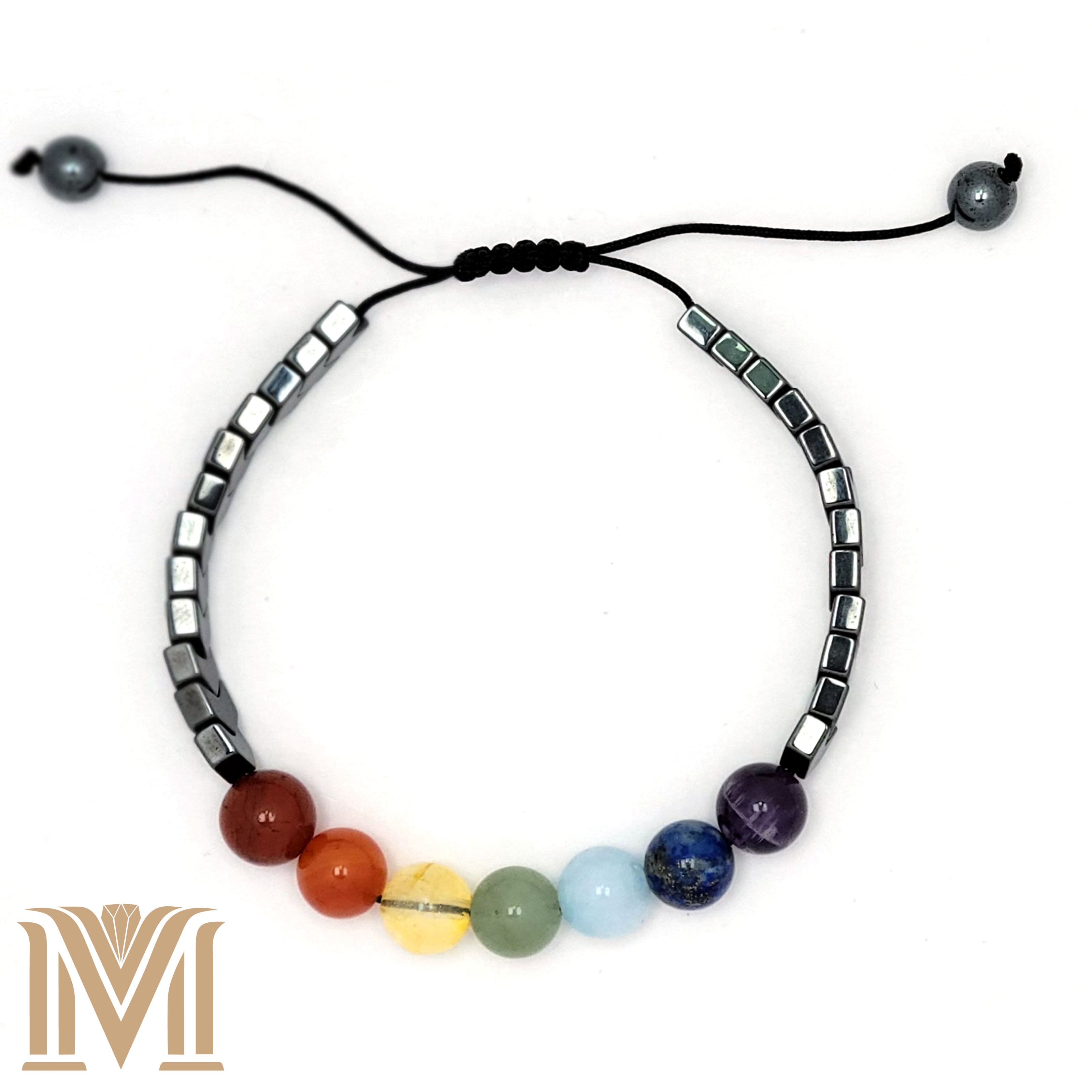 Experience equilibrium with the Chakra Balance Bracelet, a symphony of the earth's vibrations on your wrist. This unisex accessory, adjustable for a tailored fit, encapsulates harmony in its design, where robust hematite segments meet the vivid hues of the seven chakras. Each bead represents a chakra, starting with the grounding red jasper, through the passionate carnelian, the luminous citrine, heart-centering green aventurine, serene aquamarine, the intuitive lapis lazuli, to the crown's amethyst.