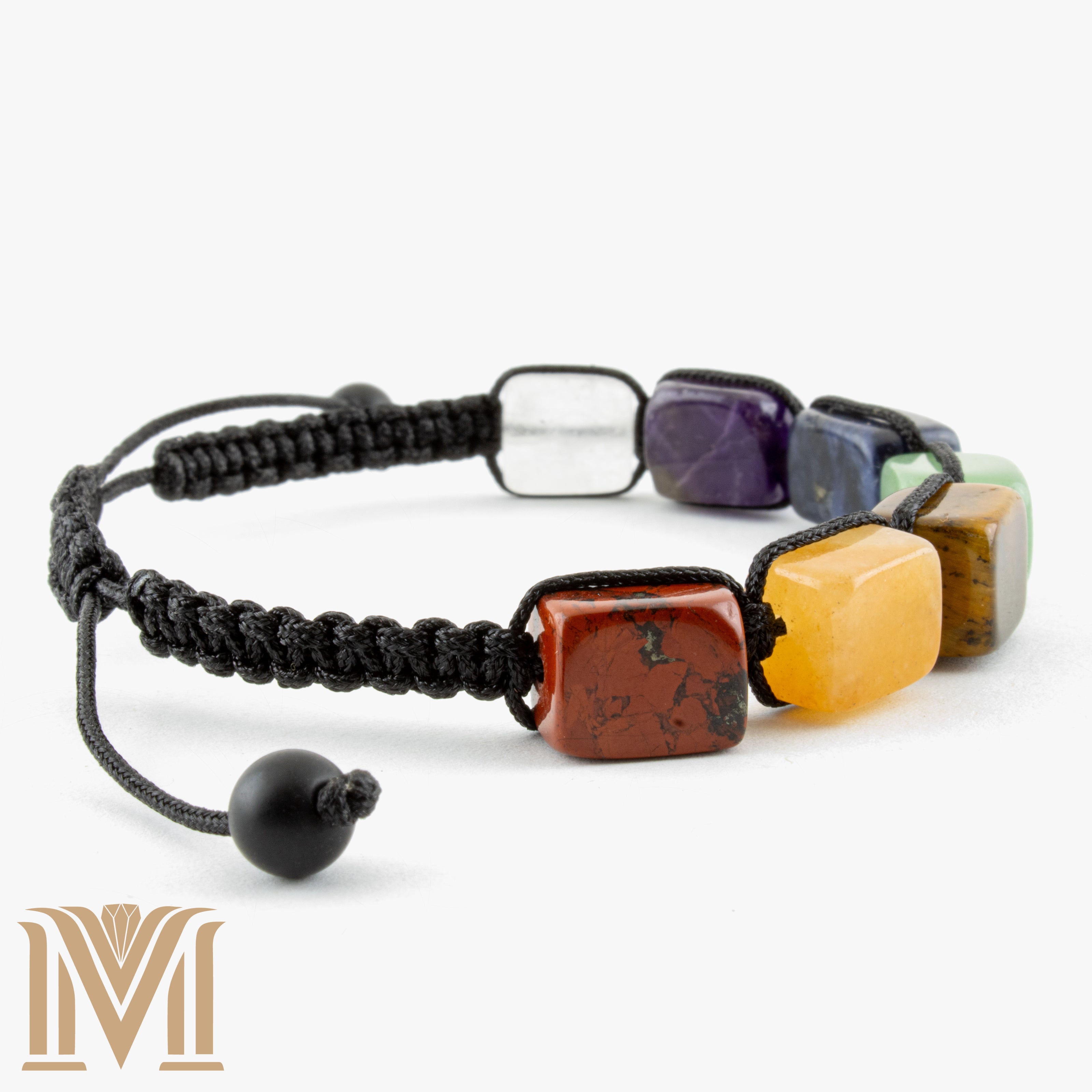 Channel the vibrancy of the universe with the Cosmic Pulse bracelet — a handcrafted macramé piece featuring a powerful sequence of natural gemstone cubes. Designed with a unisex silhouette and adjustable black cord, this bracelet harmonizes both aesthetic appeal and energetic balance. Each stone is meticulously chosen to align with one of the seven chakras, offering style with purpose.