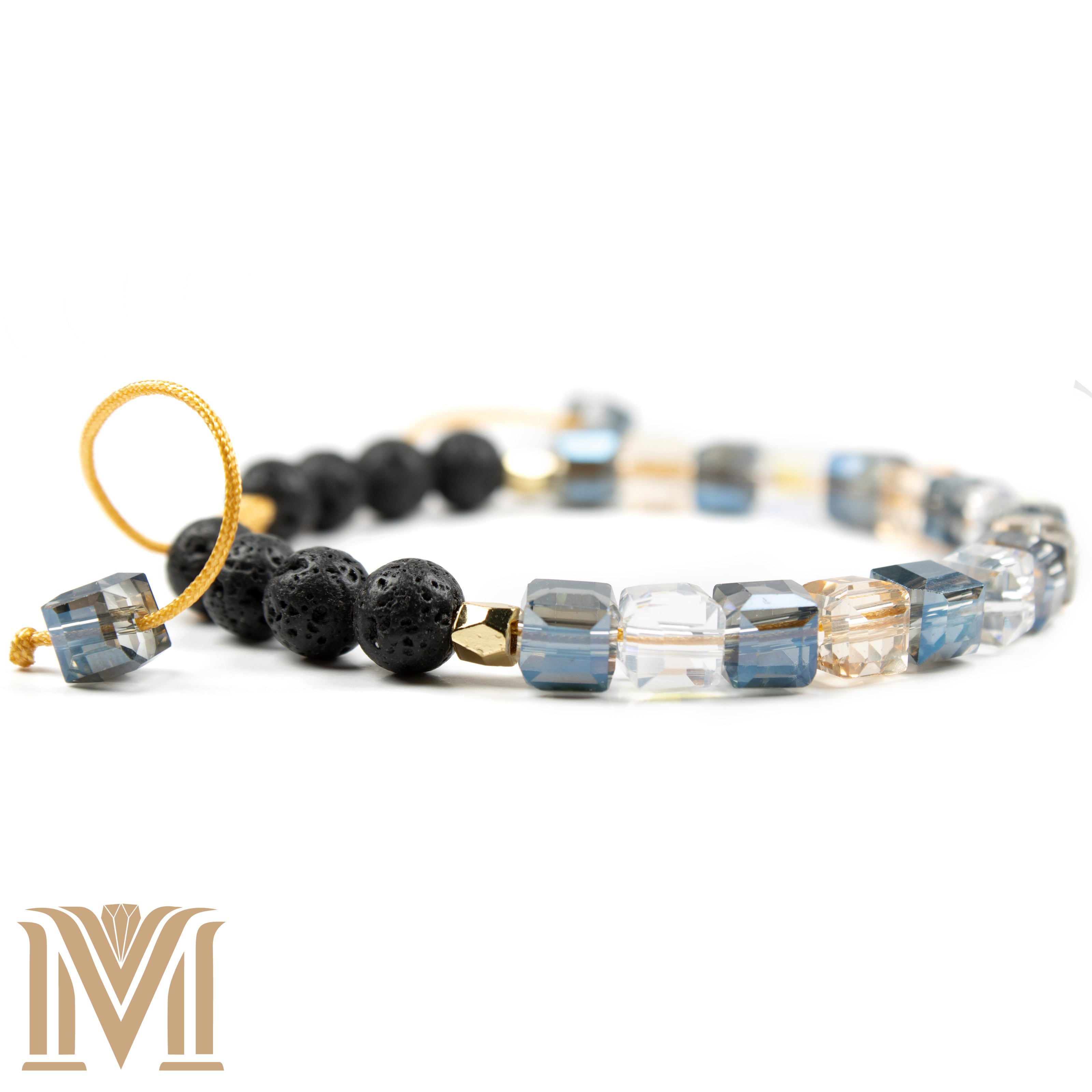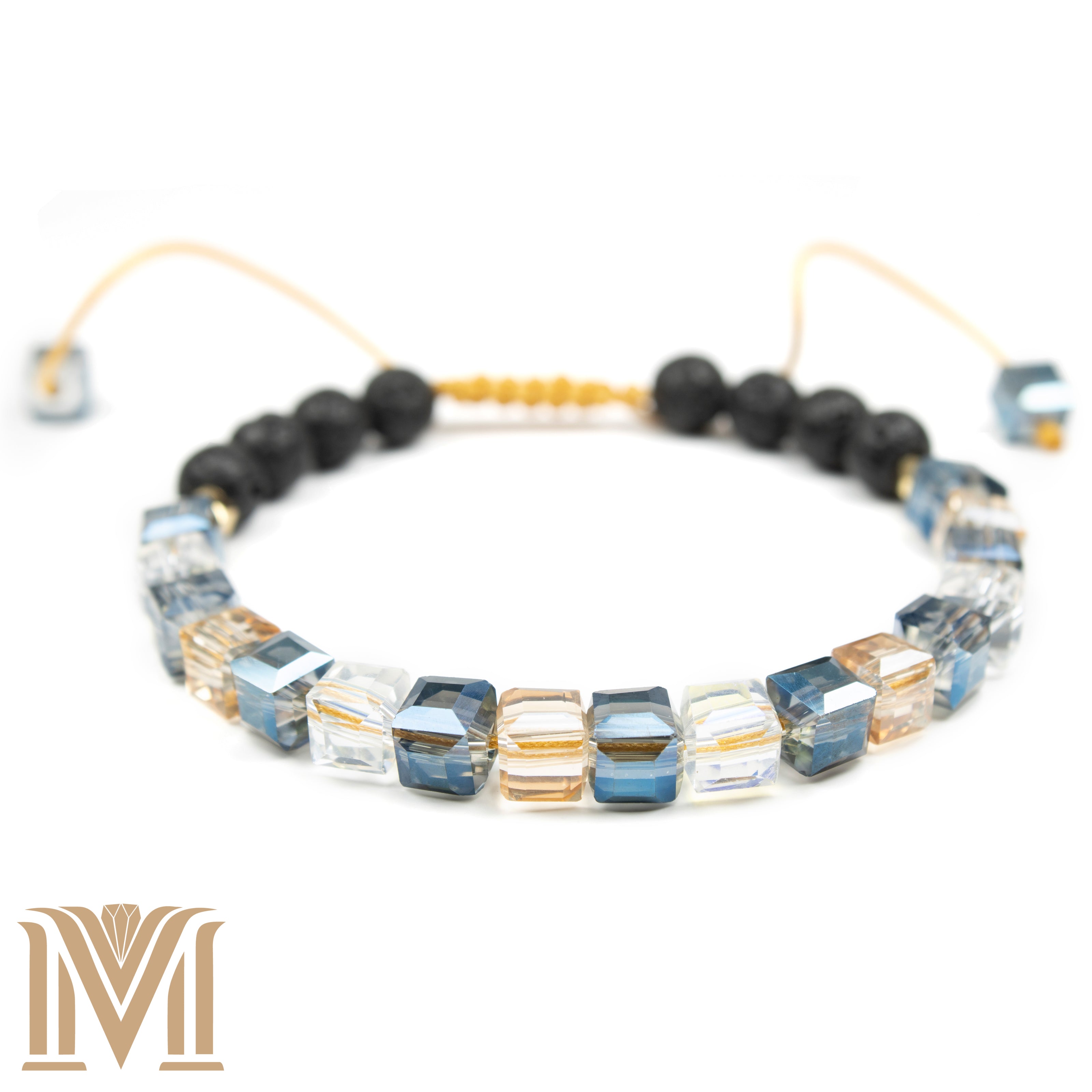 The blend of rich black lava stones, shimmering glass cubes in shades of light blue, champagne, and crystal, along with the radiant golden cord, makes this bracelet a visual treat. Pair it with minimalist or bold outfits to add a spark of brilliance and depth to your style.