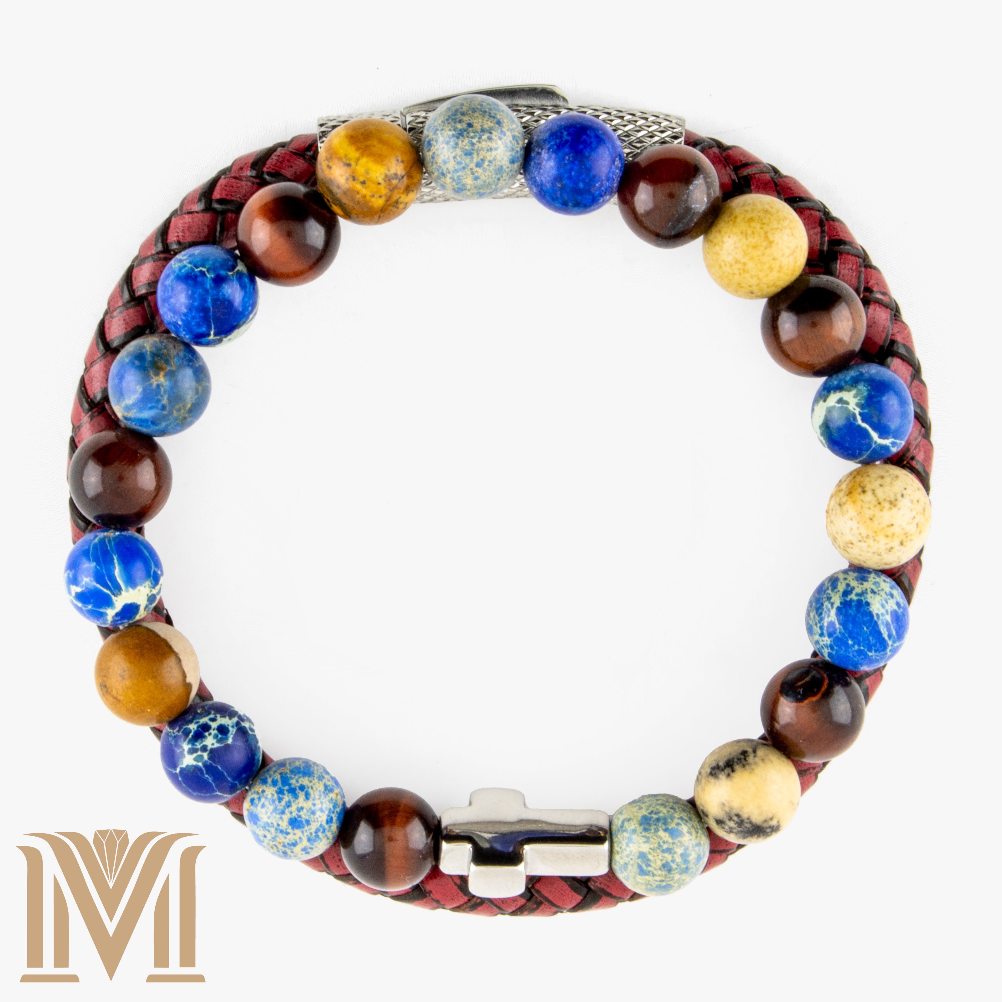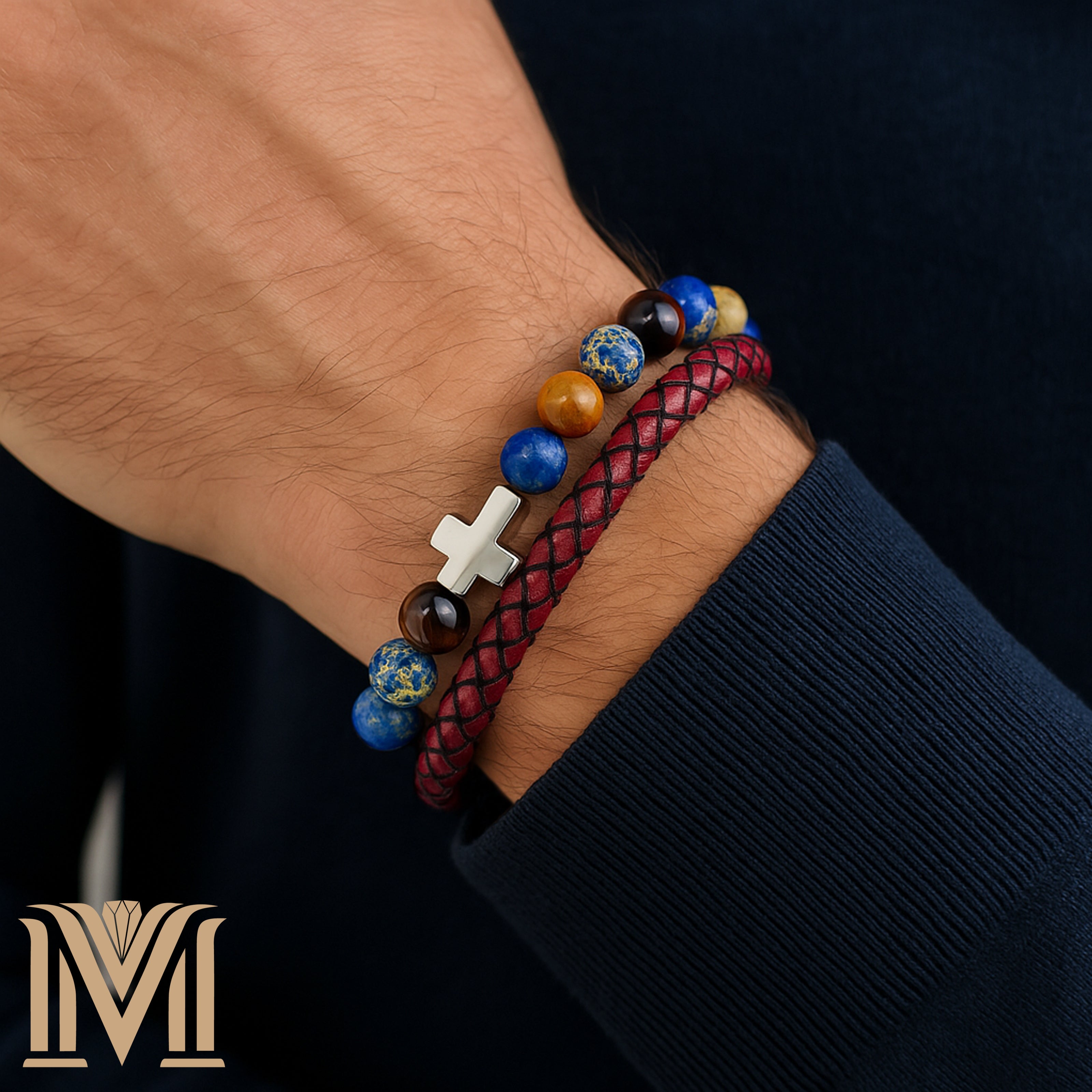 Discover the unique elegance and symbolic power of our Eternal Valor bracelet, expertly designed for the modern man. This double bracelet set features an elastic cord adorned with a striking combination of Red Tiger Eye, Picture Jasper, and Blue Imperial Jasper beads, accented with a stainless steel cross charm. Paired with a braided leather bracelet and a secure stainless steel lock, this piece seamlessly blends rugged masculinity with refined style.