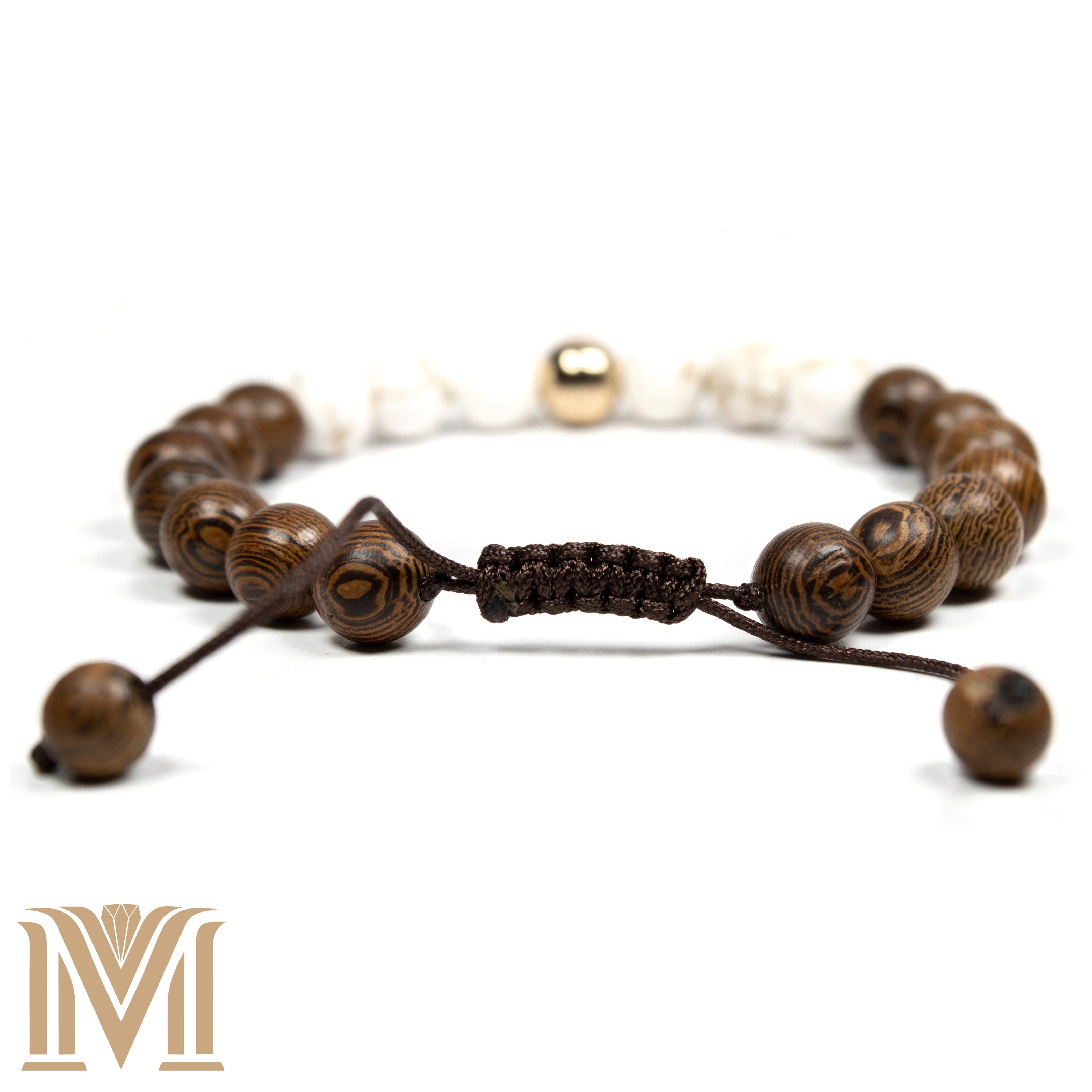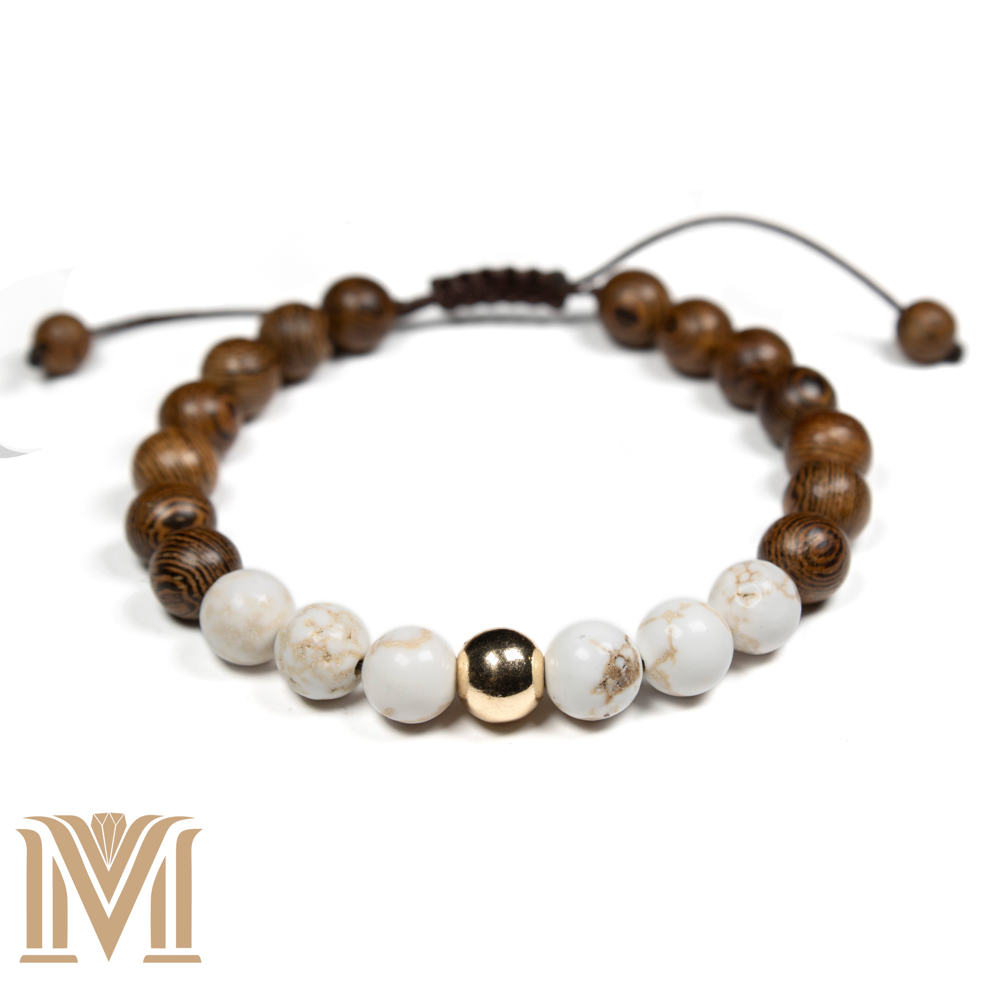 Introducing the "Golden Harmony Bracelet" – an exquisite blend of earthy elegance and sparkling charm. This adjustable bracelet features 8mm wooden beads and golden howlite, centered by a striking golden hematite bead. The natural wood tones contrast beautifully with the creamy white and gold-speckled howlite, making it a versatile piece that complements both casual and formal attire.