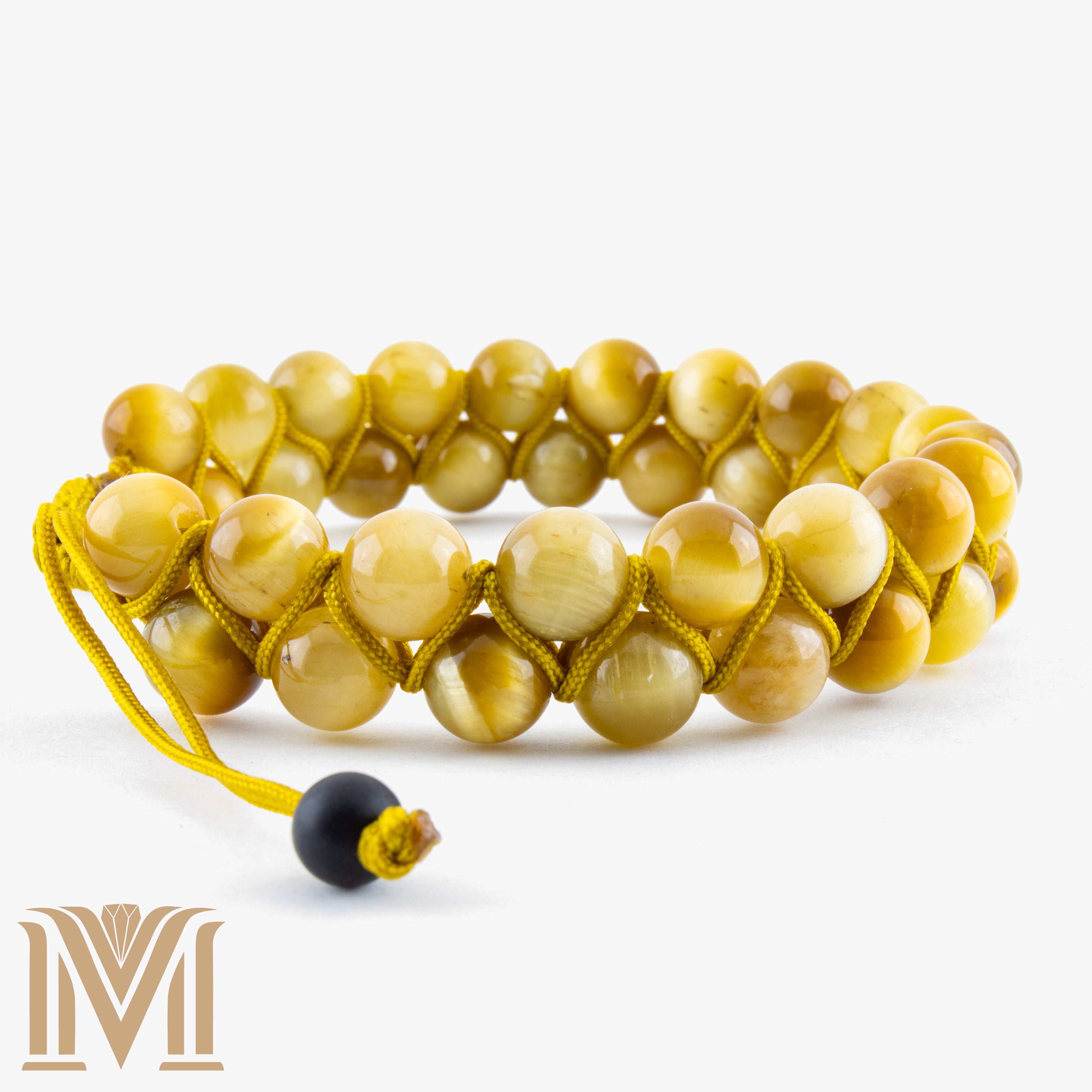 Radiating warmth and strength, Golden Calm is a dual-layer handmade bracelet crafted from radiant golden-colored Tiger's Eye beads. Each polished sphere carries a silky, cat-eye shimmer, woven tightly into sunshine-yellow cord. The bracelet’s adjustable macrame closure makes it a versatile and stylish choice for all wrist sizes and identities, embracing both elegance and empowerment.