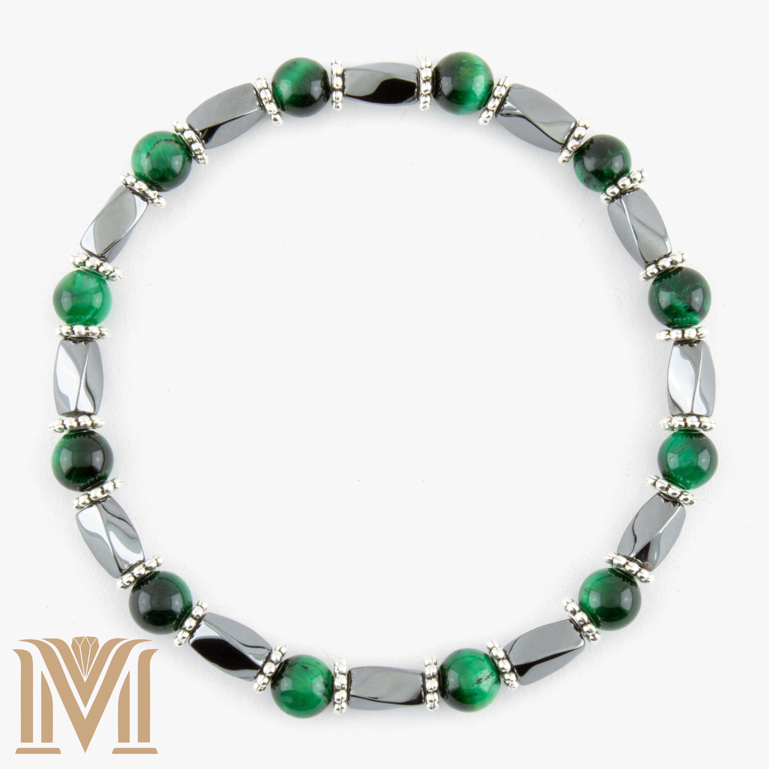 Discover the power of balance and bold elegance with the Forest Pulse bracelet—a handcrafted unisex piece made with striking green Tiger’s Eye beads, polished hematite, and decorative silver-toned alloy spacers. The deep emerald hues of the Tiger’s Eye radiate protection and vitality, historically believed to offer mental clarity and spiritual strength. Meanwhile, hematite’s metallic luster is associated with grounding energy and emotional stability, making it a top choice for those seeking inner calm and confidence.