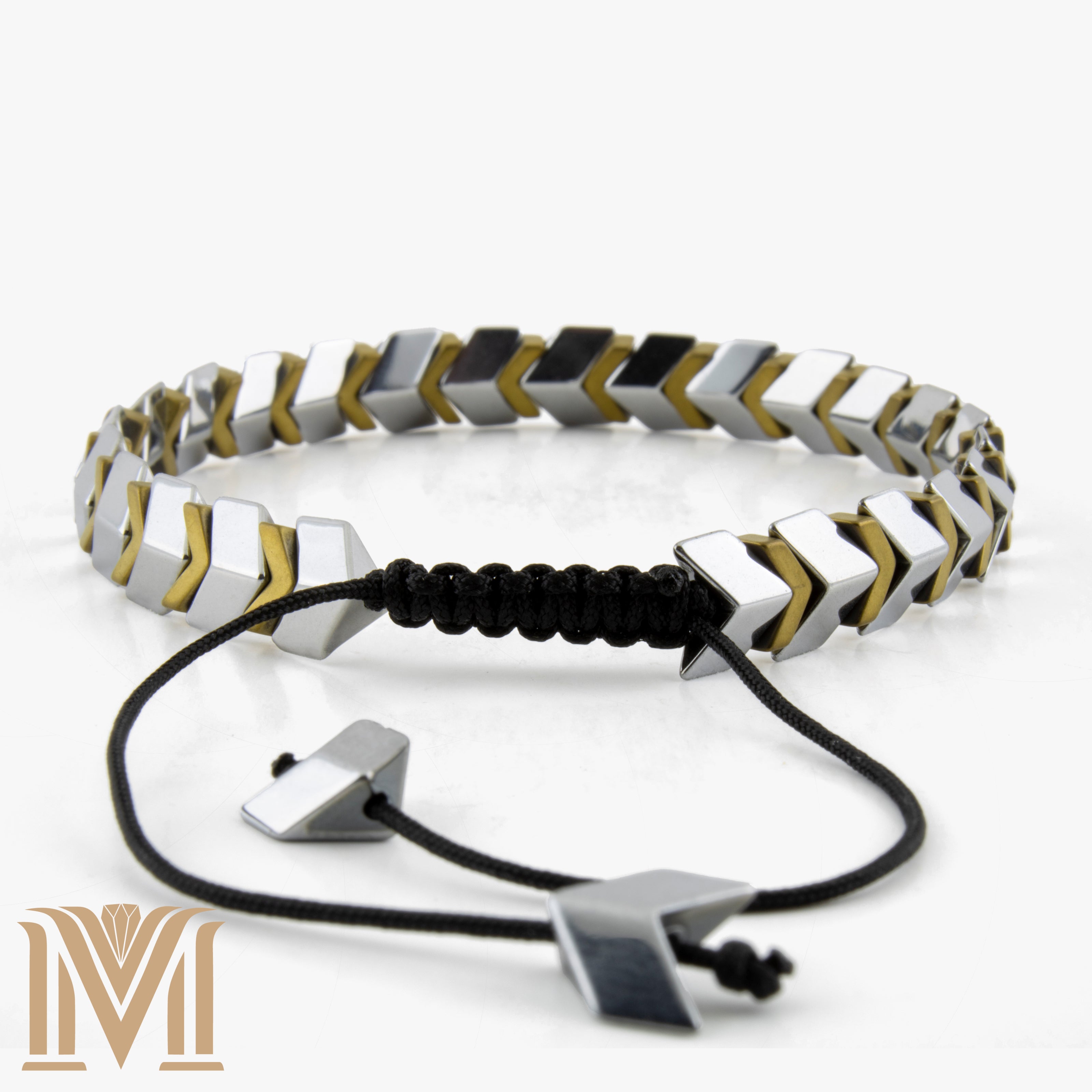 Elevate your everyday style with Arrow Alchemy, a unisex bracelet meticulously handcrafted using gold and silver-toned hematite beads shaped like sleek chevrons. This modern piece blends bold geometry with timeless elegance, designed for those who carry strength and intention in their daily wear.