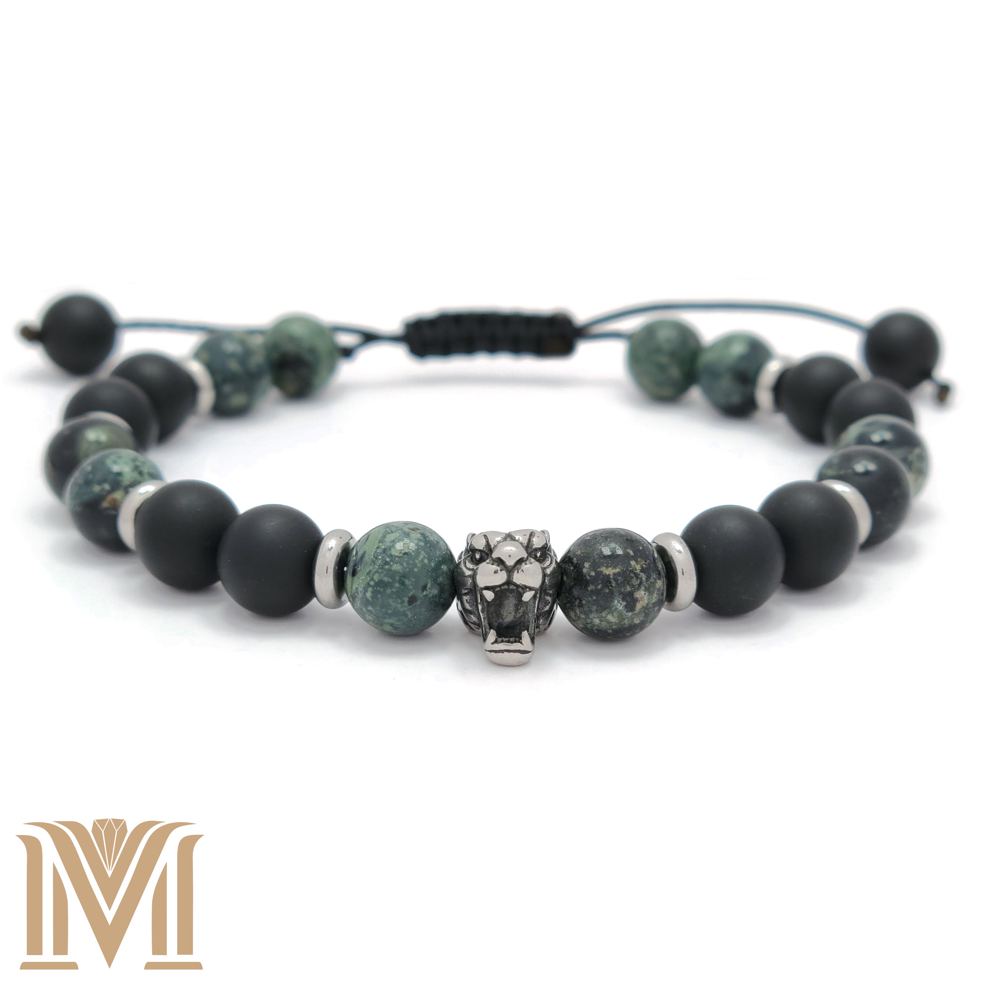 Unleash primal confidence with the Savage Spirit bracelet—a fierce, earthy blend of Kambaba Jasper and Black Onyx, brought together with sleek alloy spacers and a commanding panther head centerpiece. This handmade men’s bracelet is designed for those who lead with quiet strength, grounded energy, and unshakable focus.