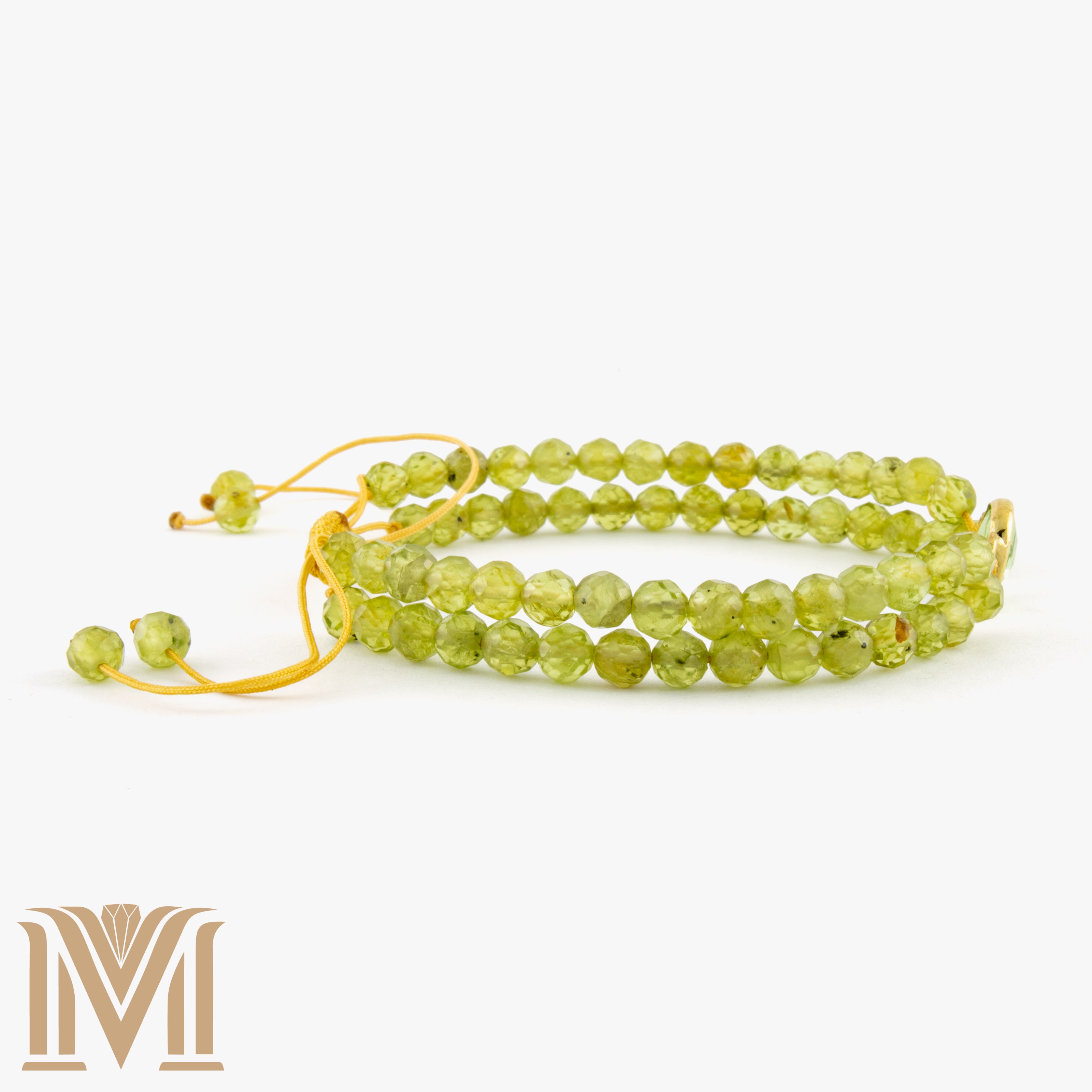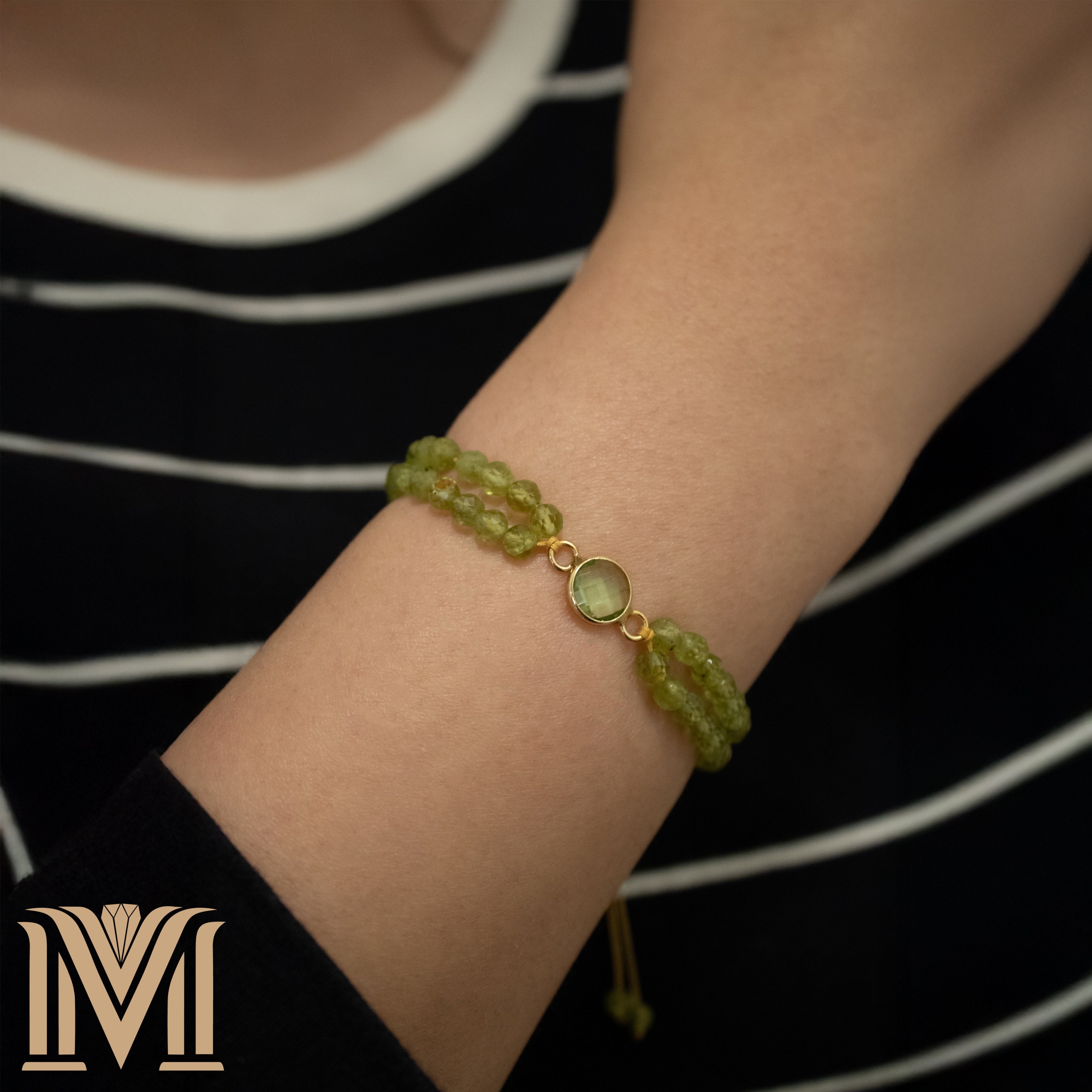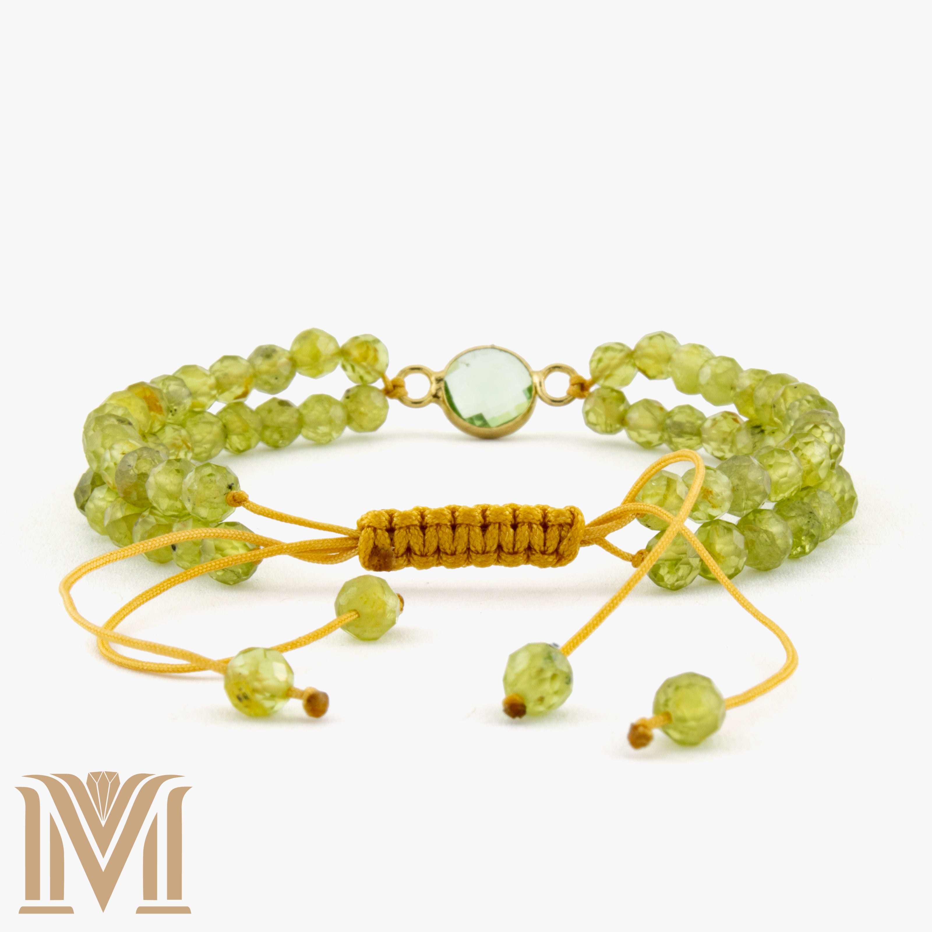 Step into serenity with the Verdant Illusion bracelet, an embodiment of renewal, clarity, and timeless charm. Handcrafted with two strands of faceted peridot gemstones, this adjustable bracelet is centered by a gold-toned stainless steel bezel cradling a gleaming green glass gem — reflecting light with every movement like morning dew on spring leaves.