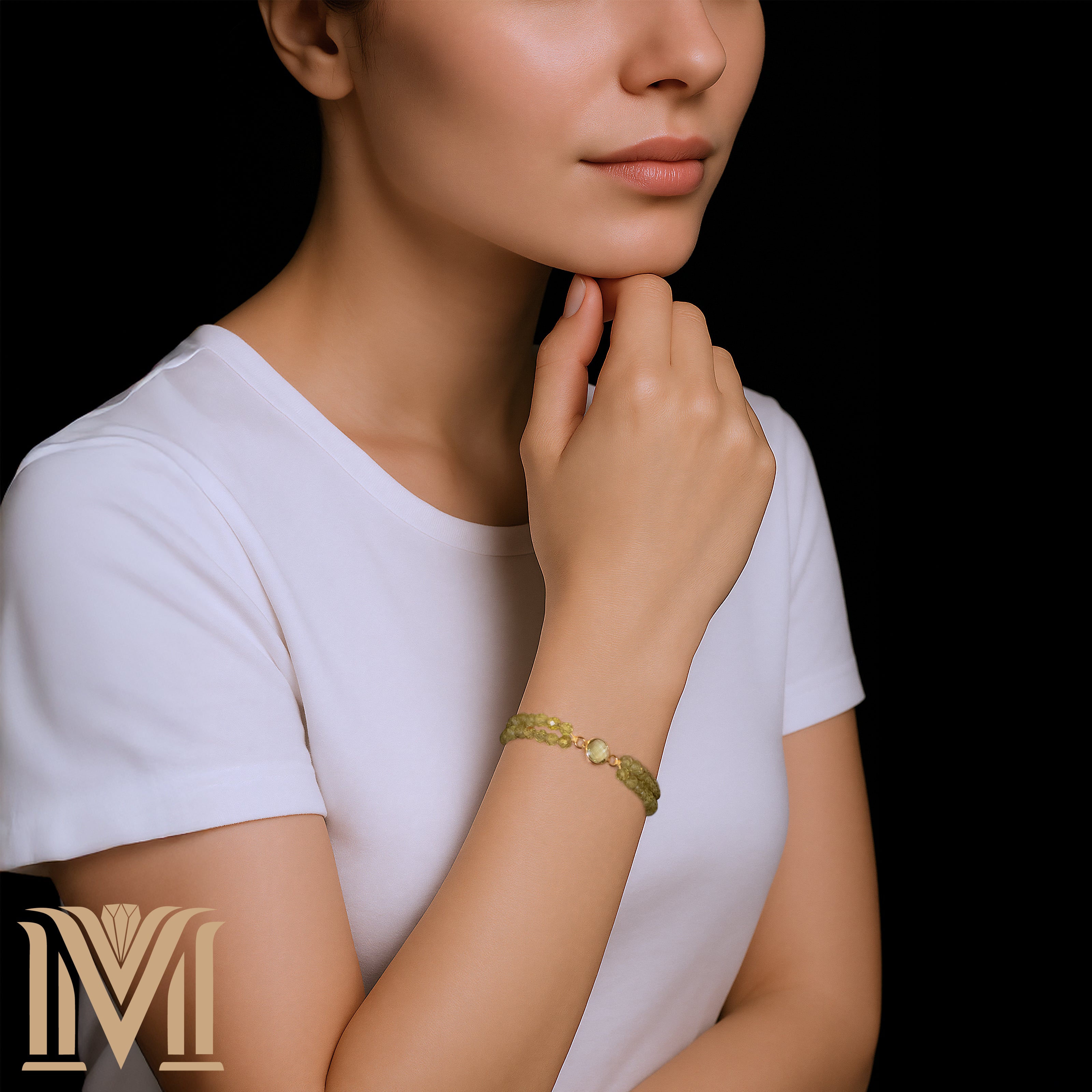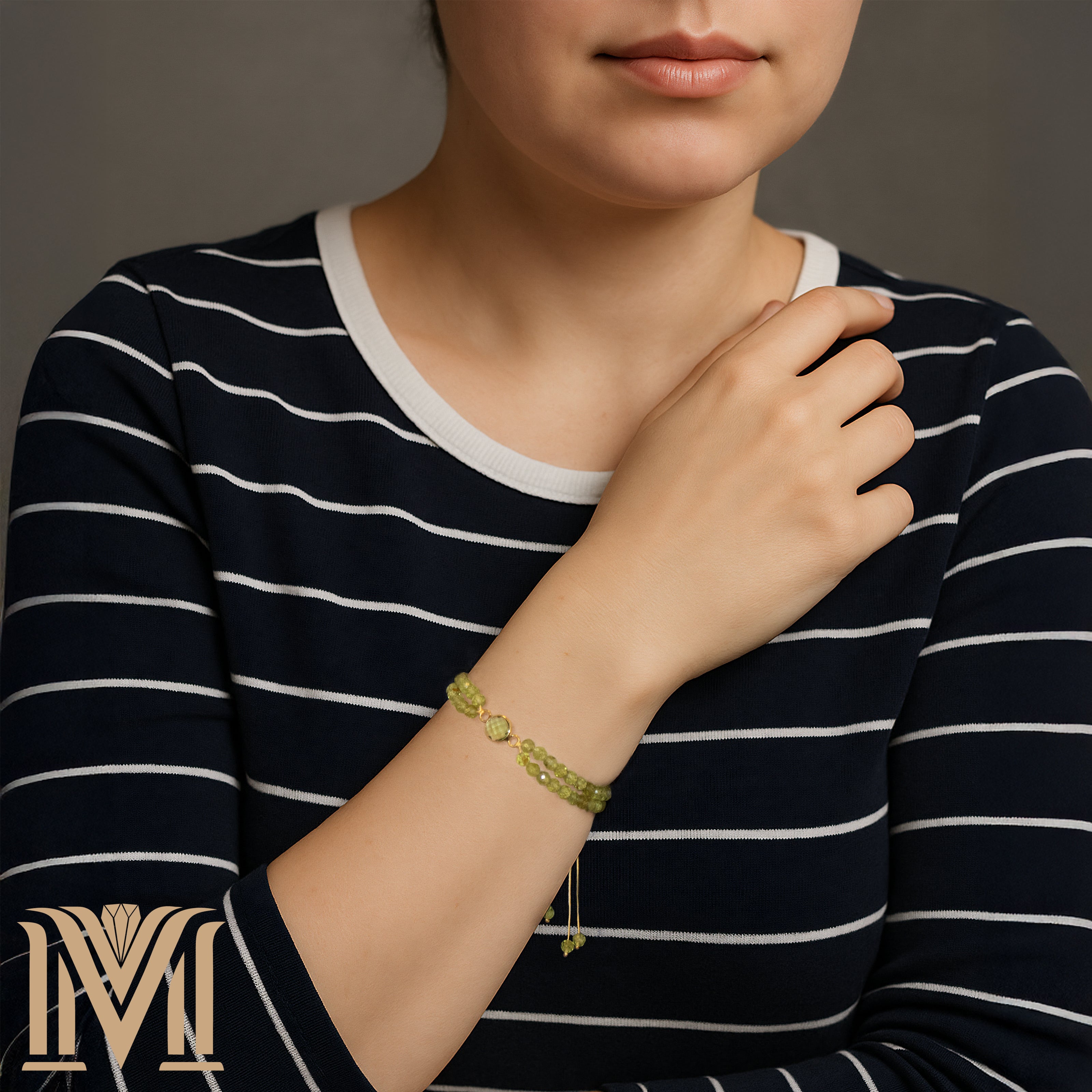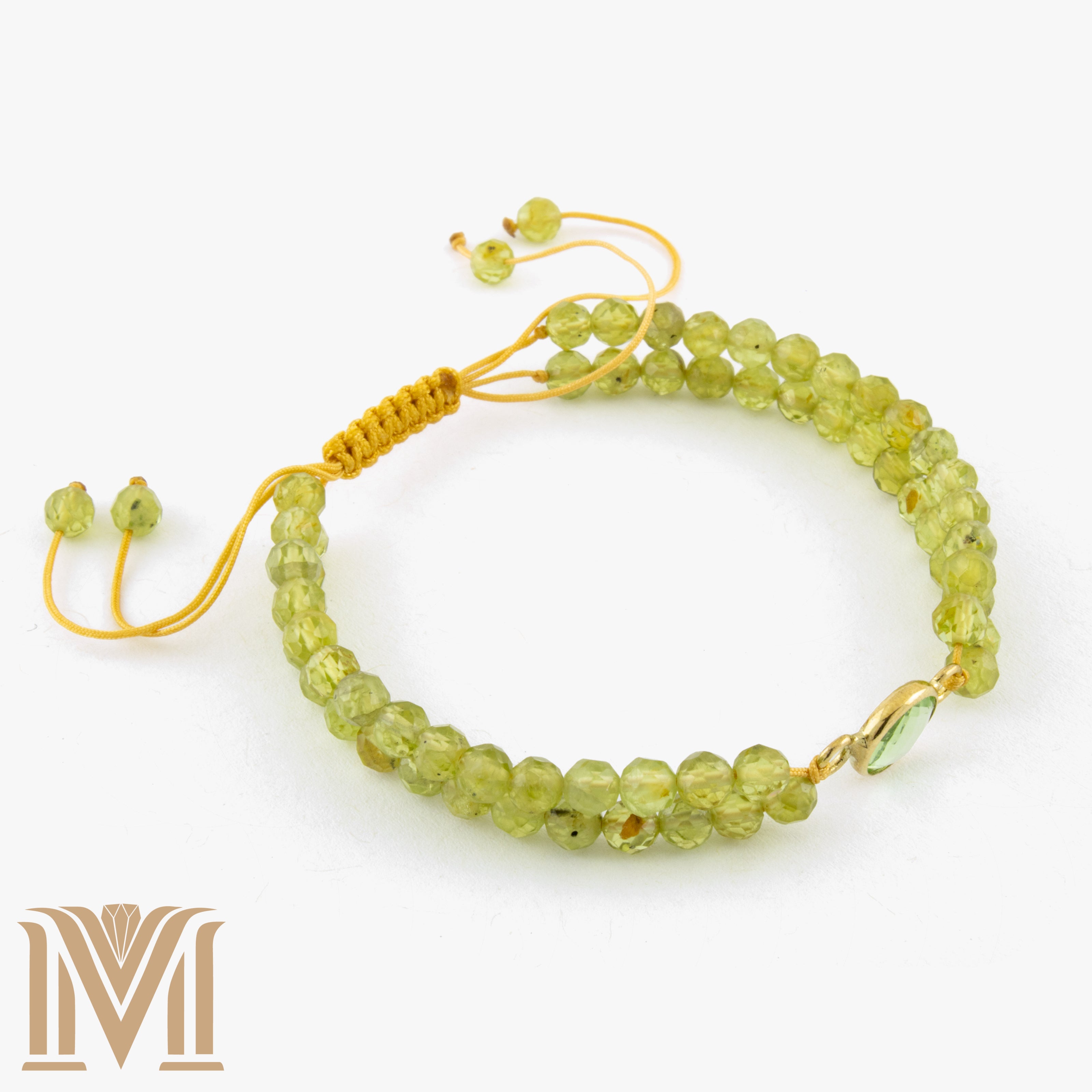Step into serenity with the Verdant Illusion bracelet, an embodiment of renewal, clarity, and timeless charm. Handcrafted with two strands of faceted peridot gemstones, this adjustable bracelet is centered by a gold-toned stainless steel bezel cradling a gleaming green glass gem — reflecting light with every movement like morning dew on spring leaves.