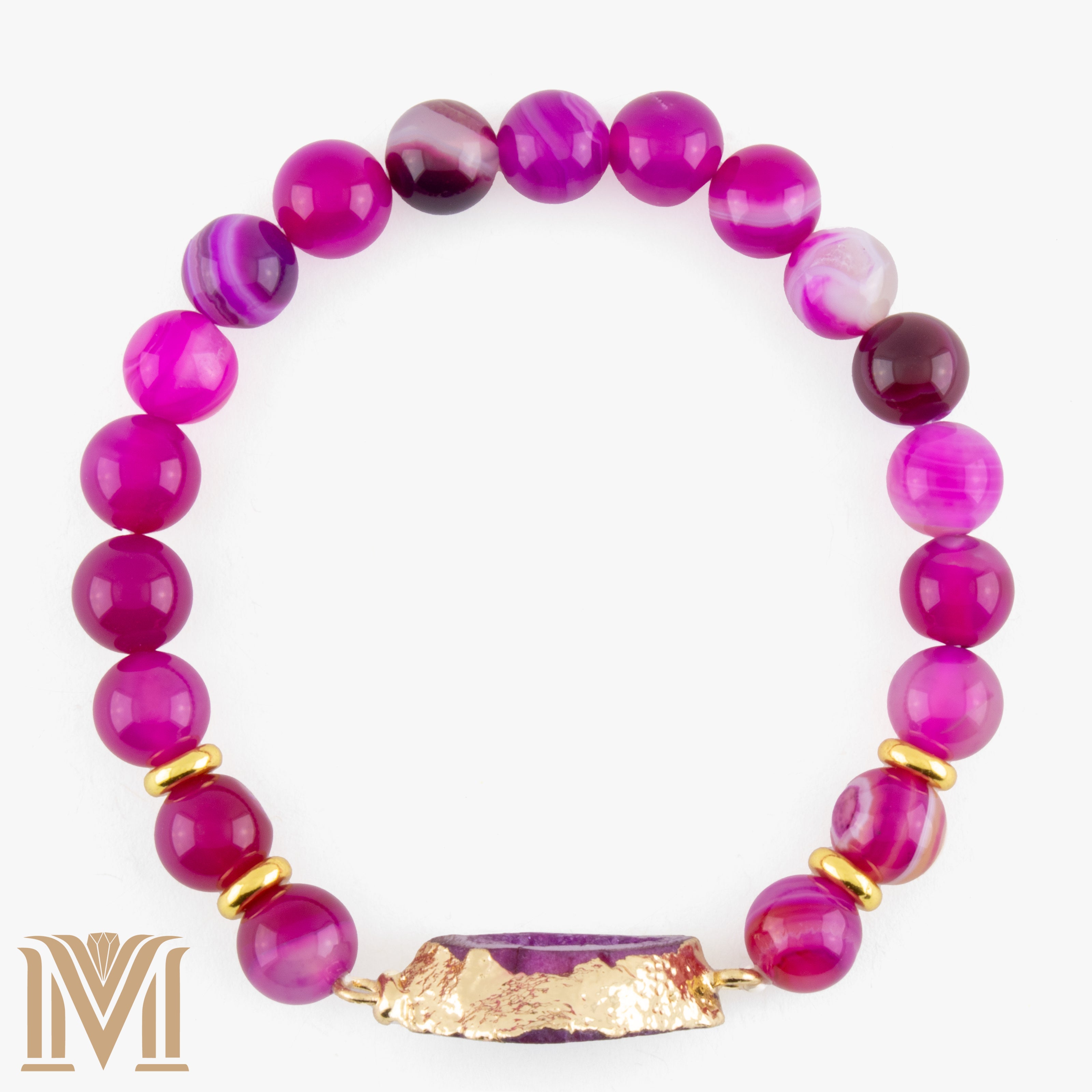 Infused with the energy of cosmic beauty and divine femininity, the Celestial Echo bracelet is a radiant statement of confidence, love, and inner light. Crafted with lustrous Pink Stripe Agate beads, this handcrafted piece is centered around a striking purple Druzy Quartz geode—gilded in gold for a luxurious touch.