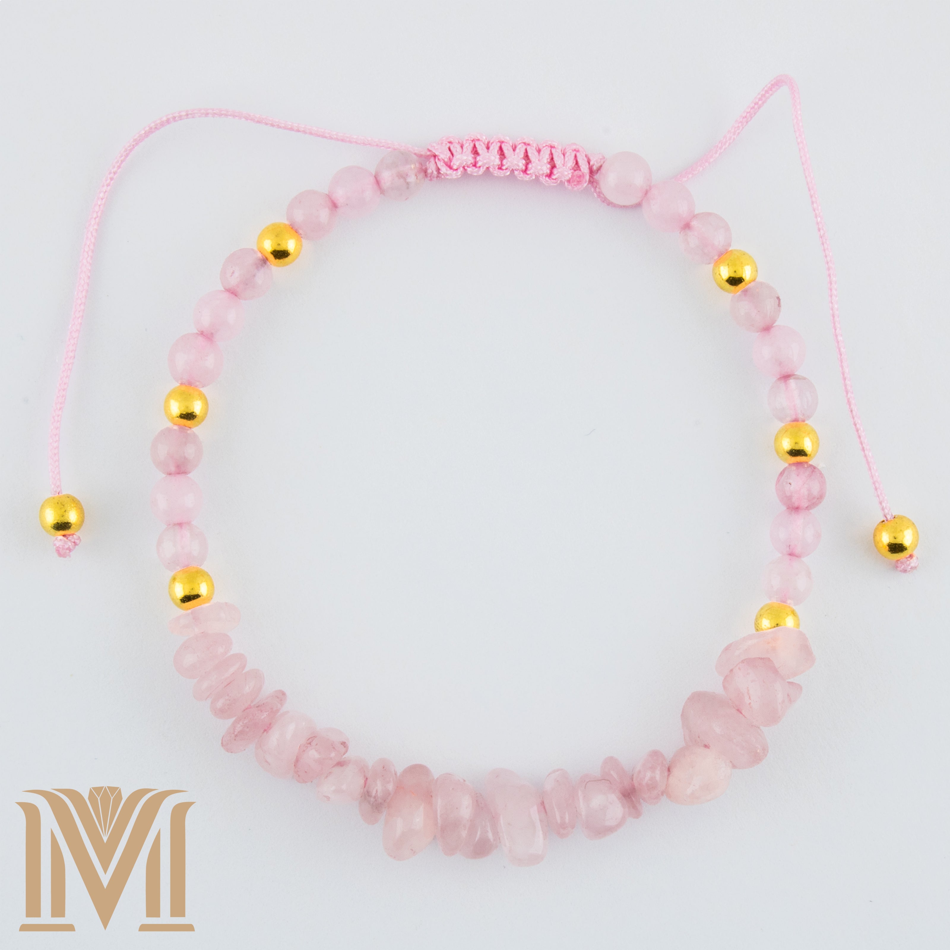 The smooth round and organic chip-cut beads reflect light beautifully, while the adjustable macramé cord ensures a comfortable fit on any wrist. Pair it with light neutrals, white linen, or even contrasting rich jewel tones for a romantic pop of pastel pink. Perfect for weddings, date nights, or self-love rituals.