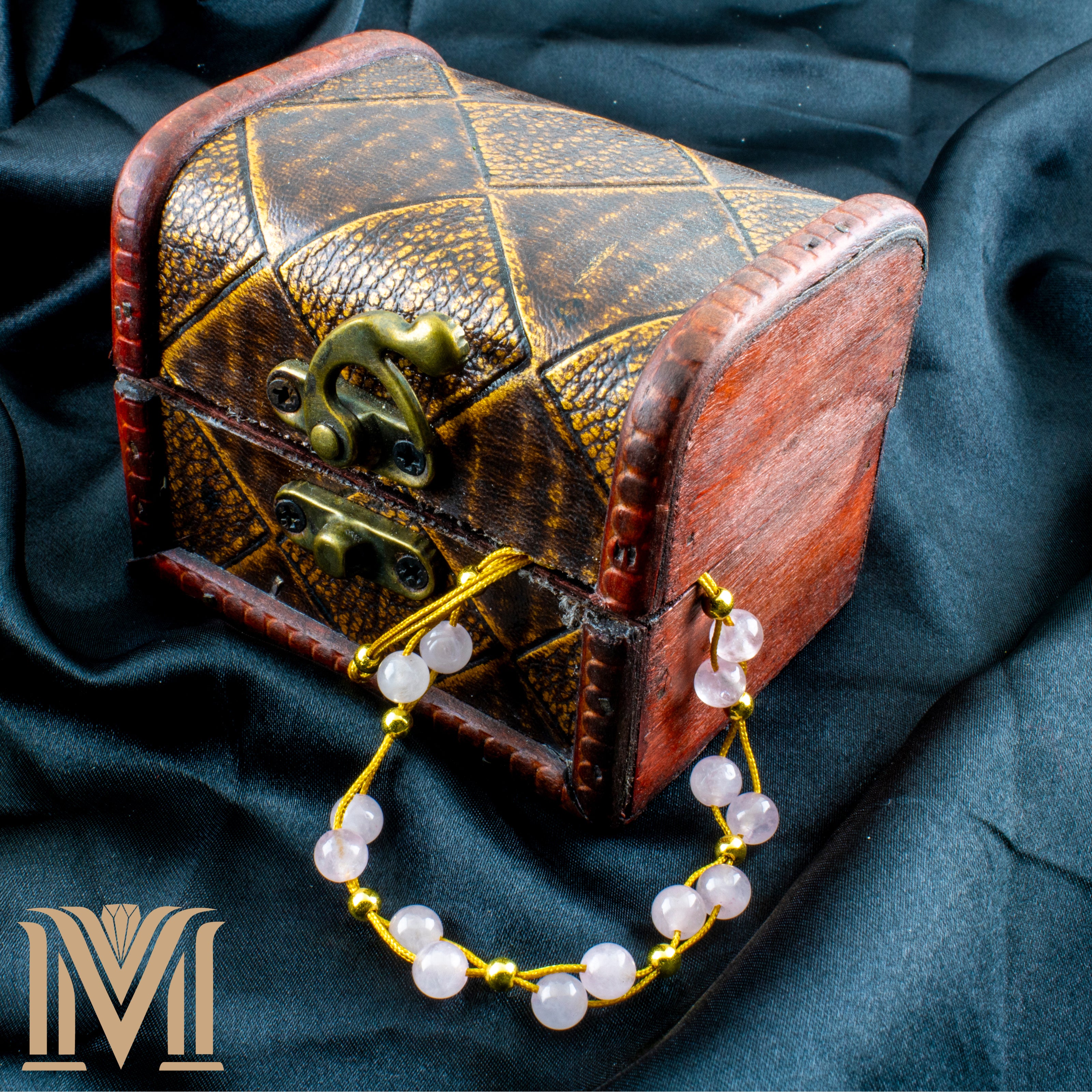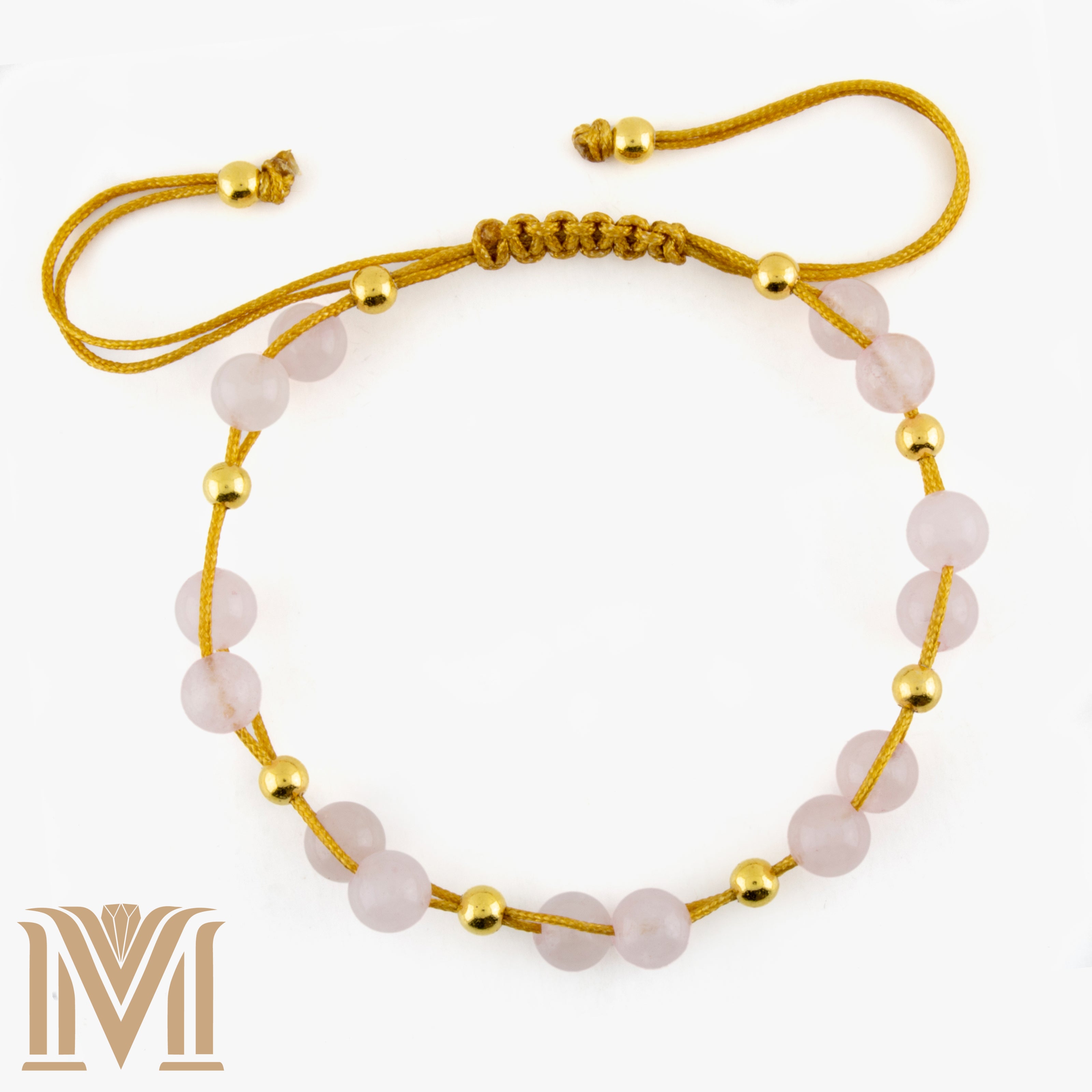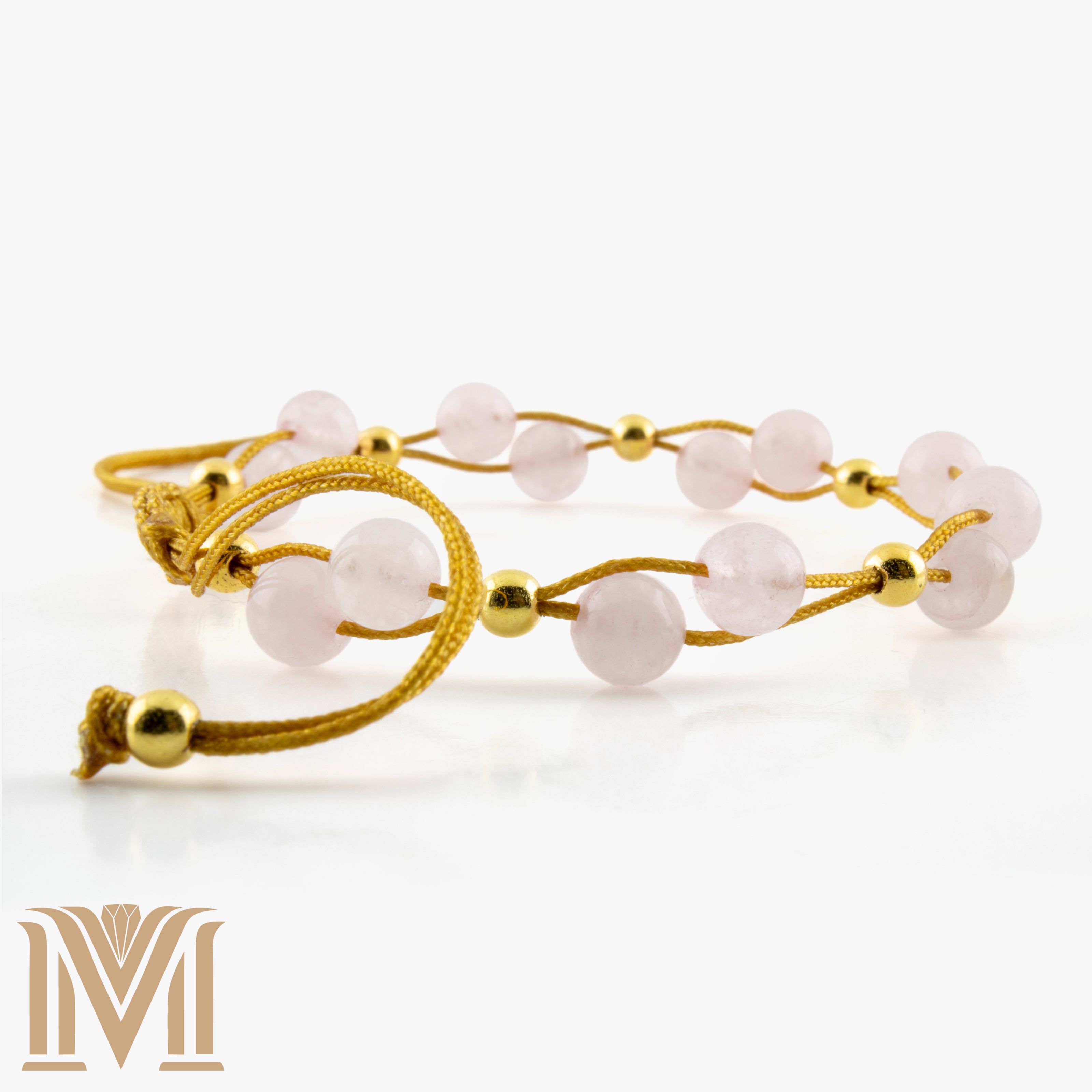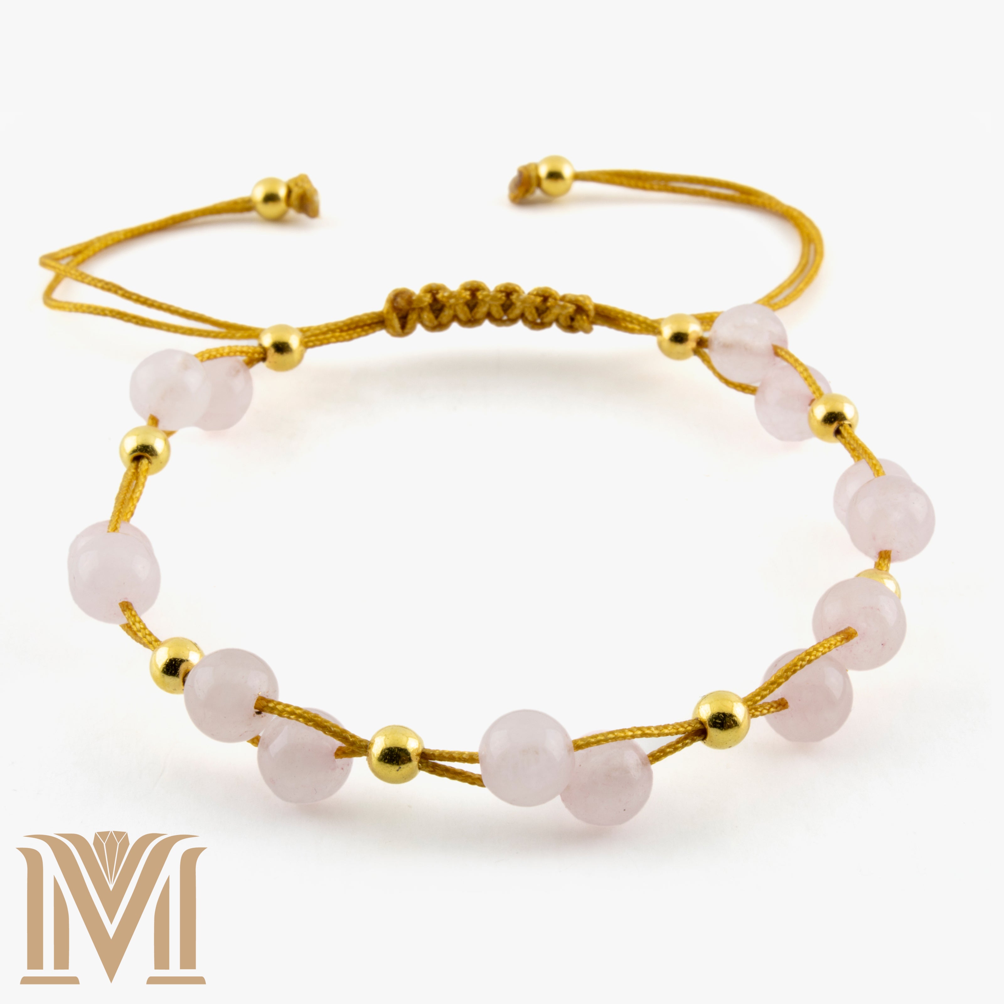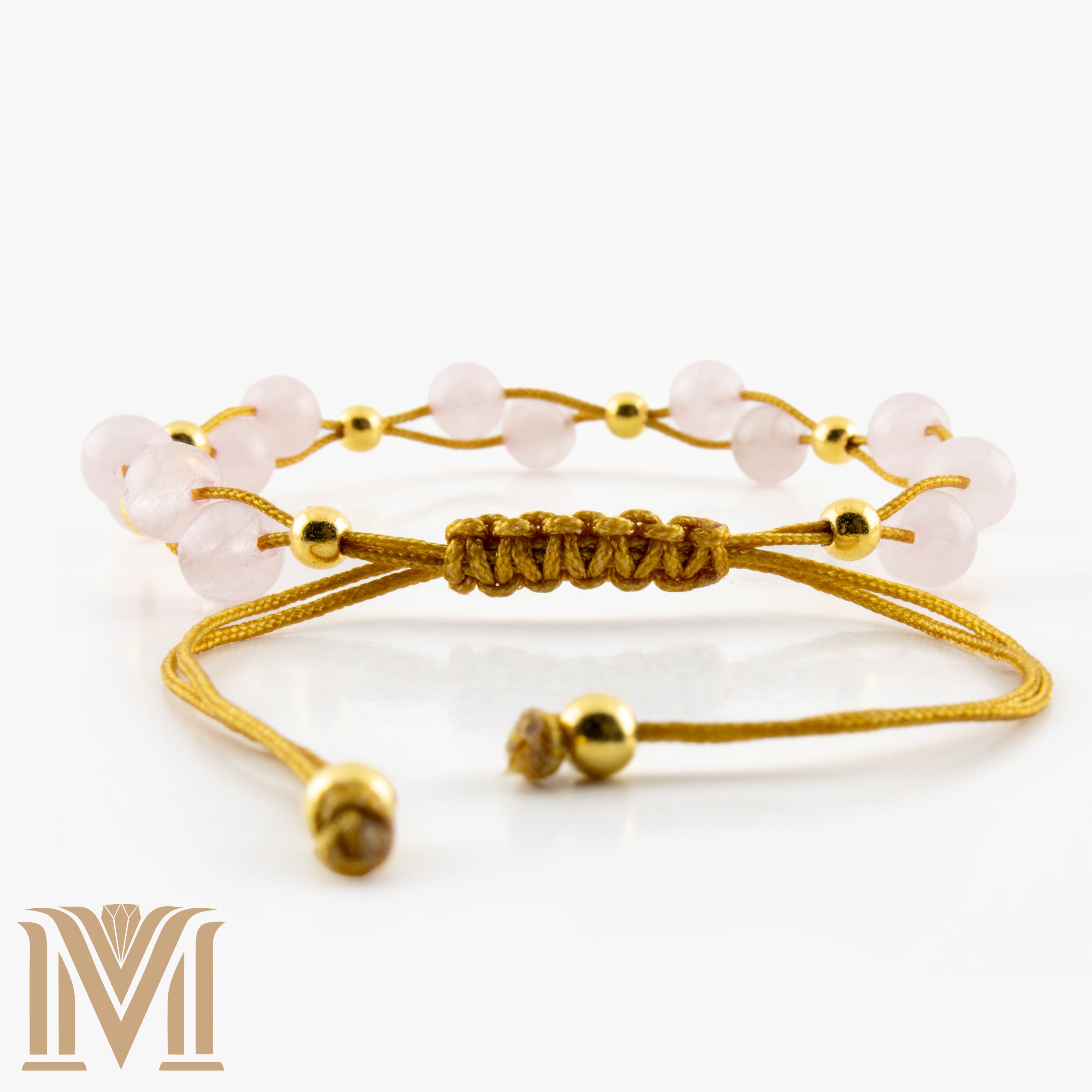 Embrace the gentle warmth of love with Rosé Glow, an elegant handmade bracelet crafted with delicate round rose quartz beads and radiant golden stainless steel accents. This bracelet is an ode to grace and tranquility, woven with a golden adjustable cord for a custom fit that speaks to comfort and beauty alike.