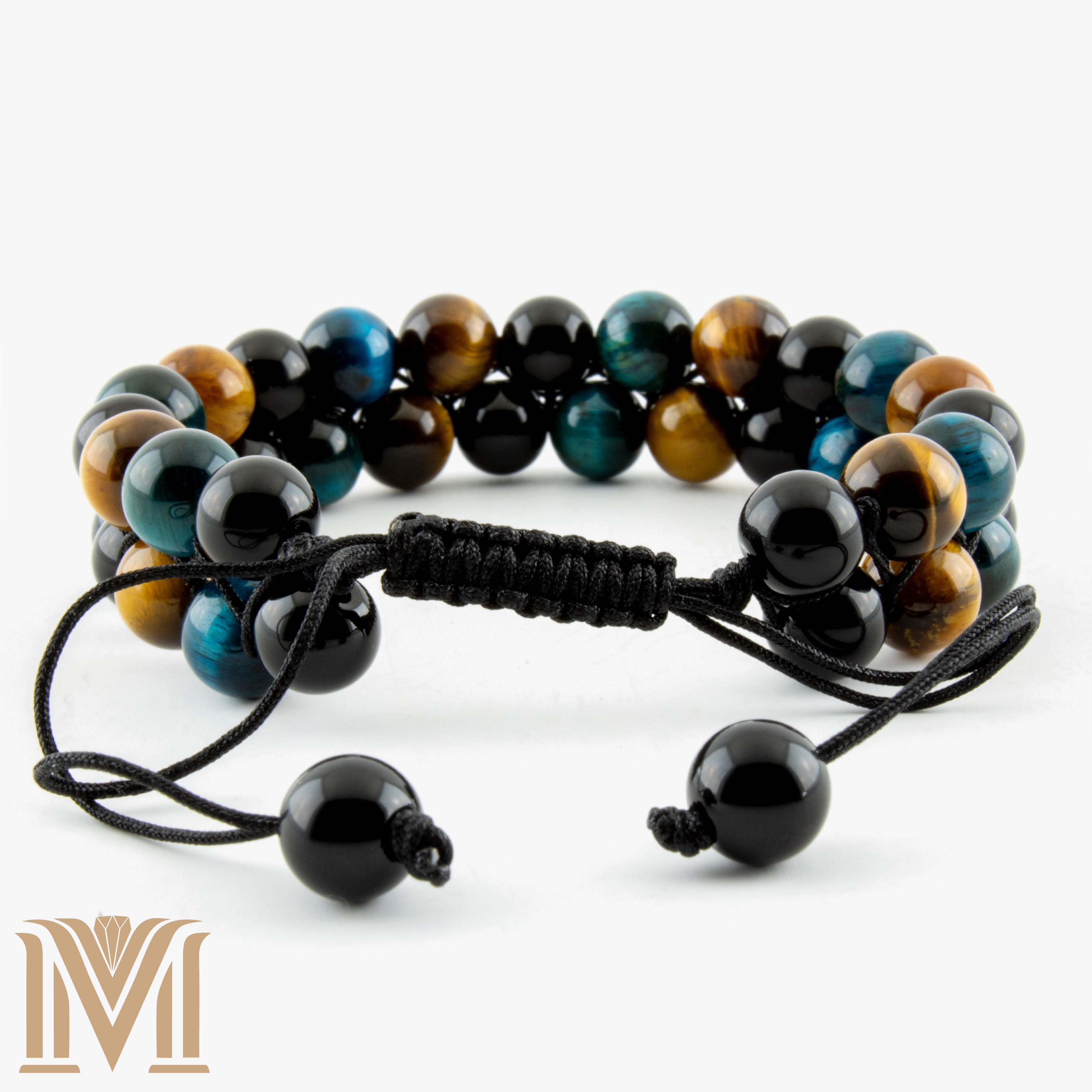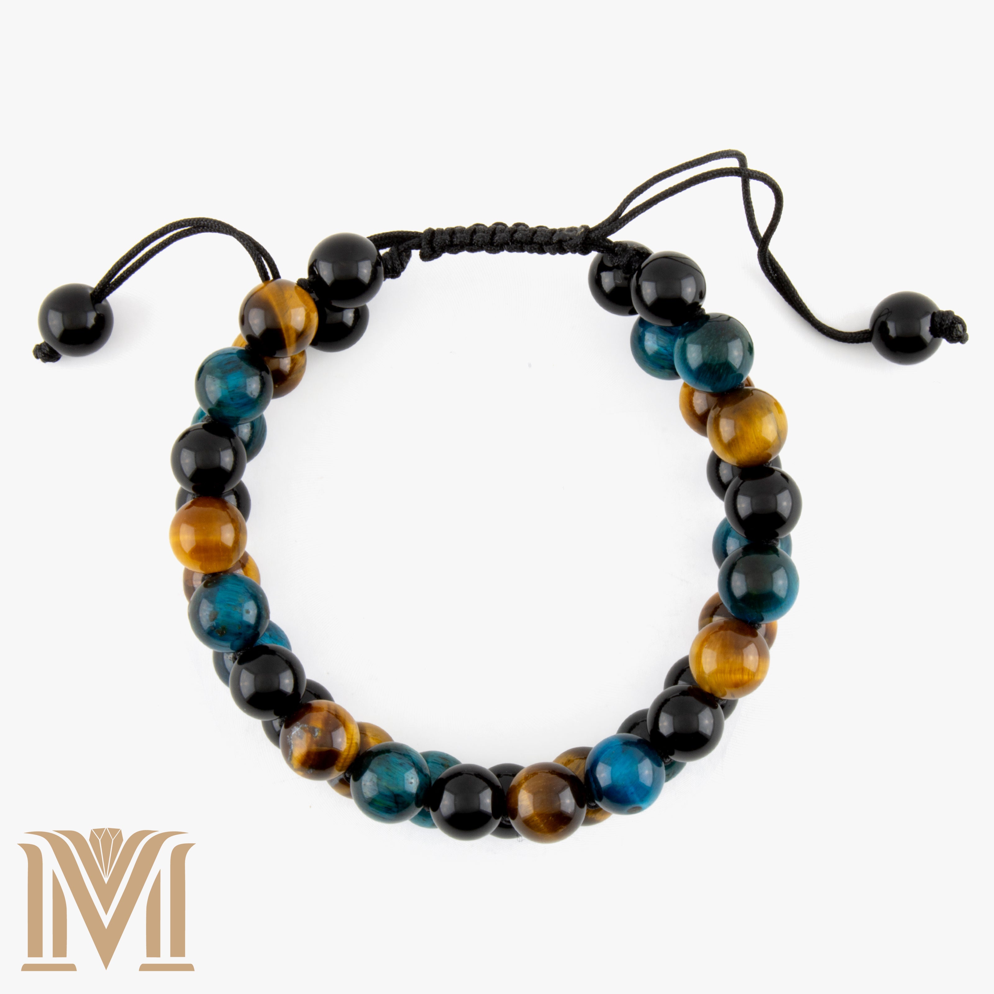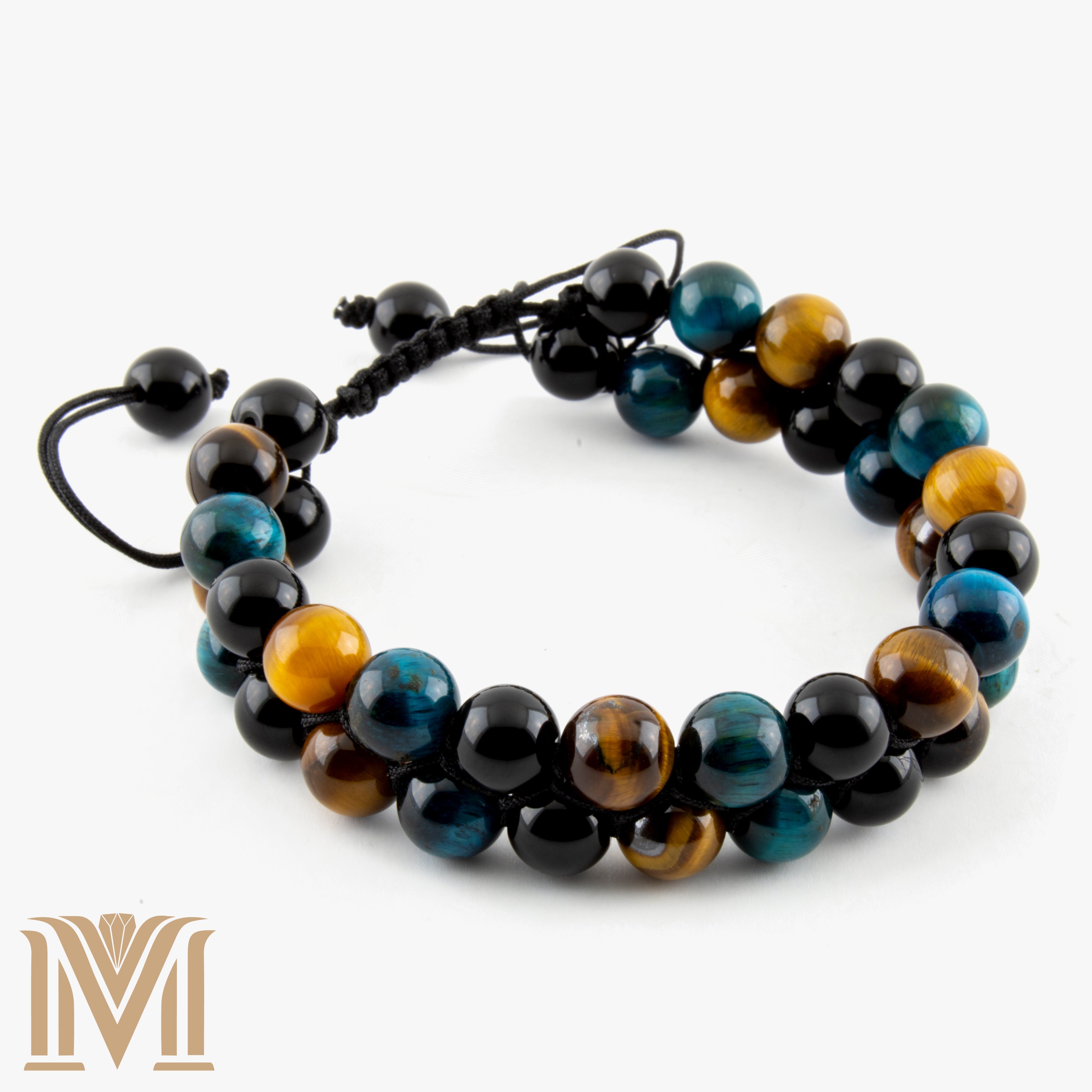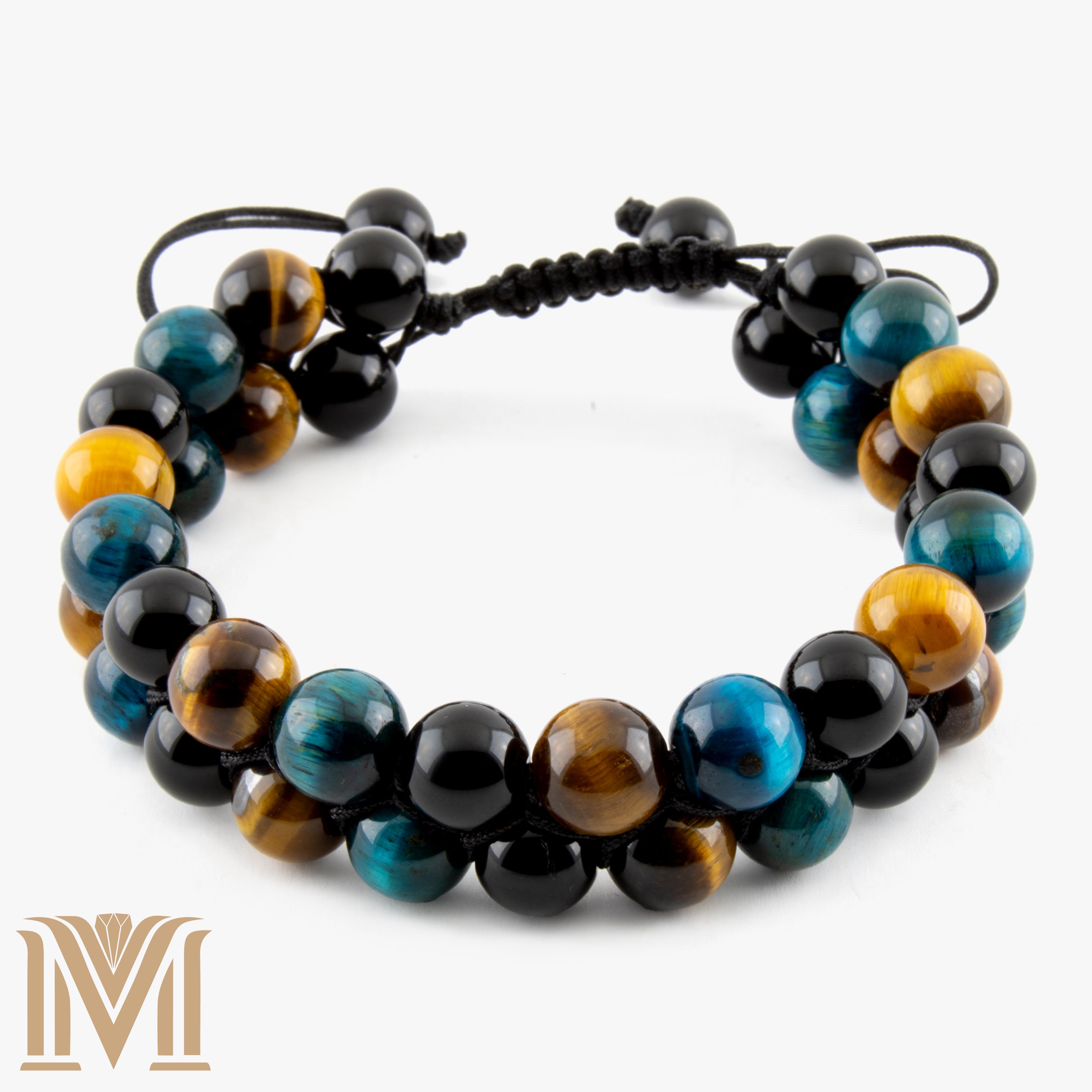 Bold, grounding, and filled with ancient energy—Elemental Focus is a statement of balance, strength, and clarity. This unisex double-layer bracelet features a dynamic trio of Blue Tiger Eye, Golden Tiger Eye, and deep Onyx gemstones. Each bead is hand-strung on a black adjustable cord to fit comfortably on any wrist, combining earthy elegance with modern energy.