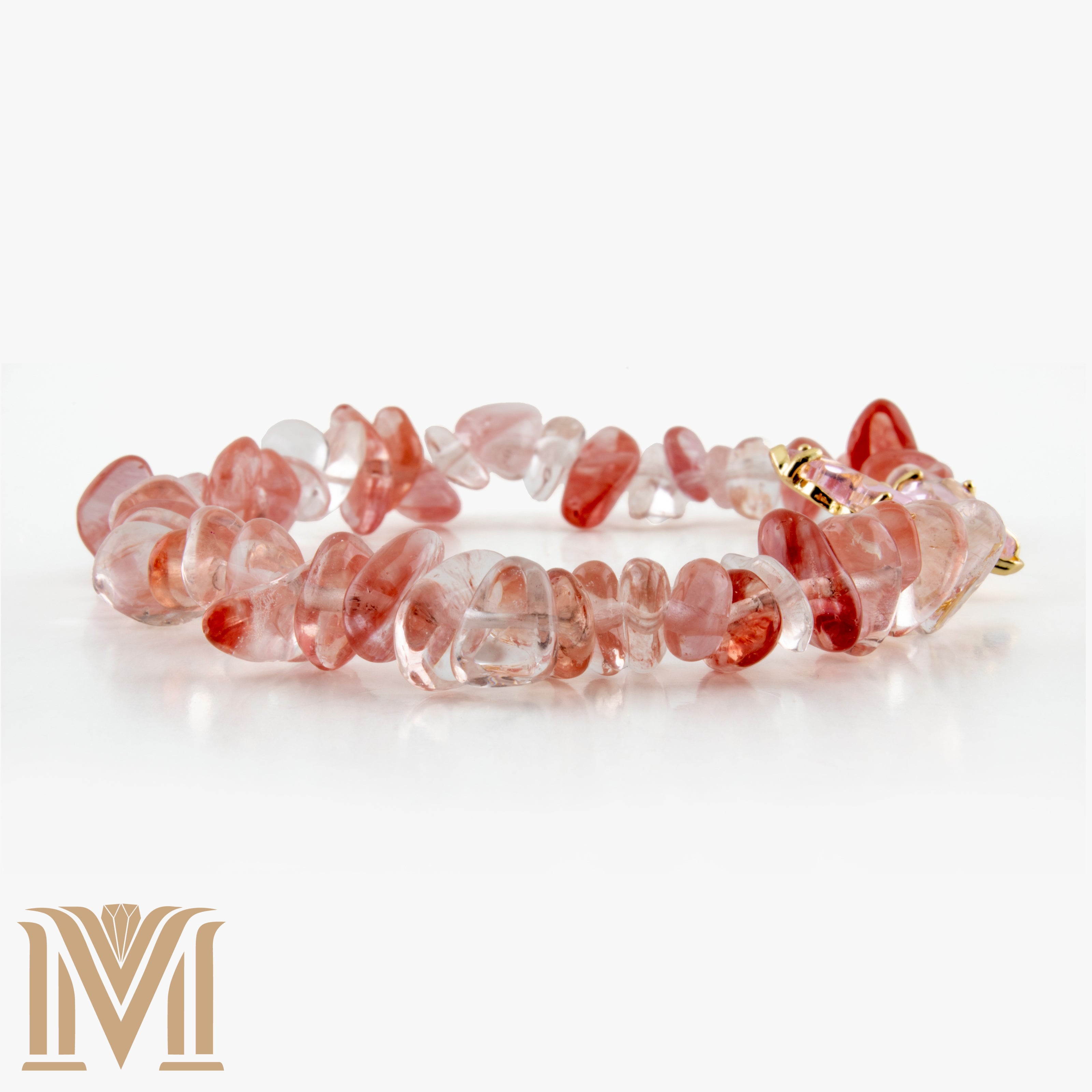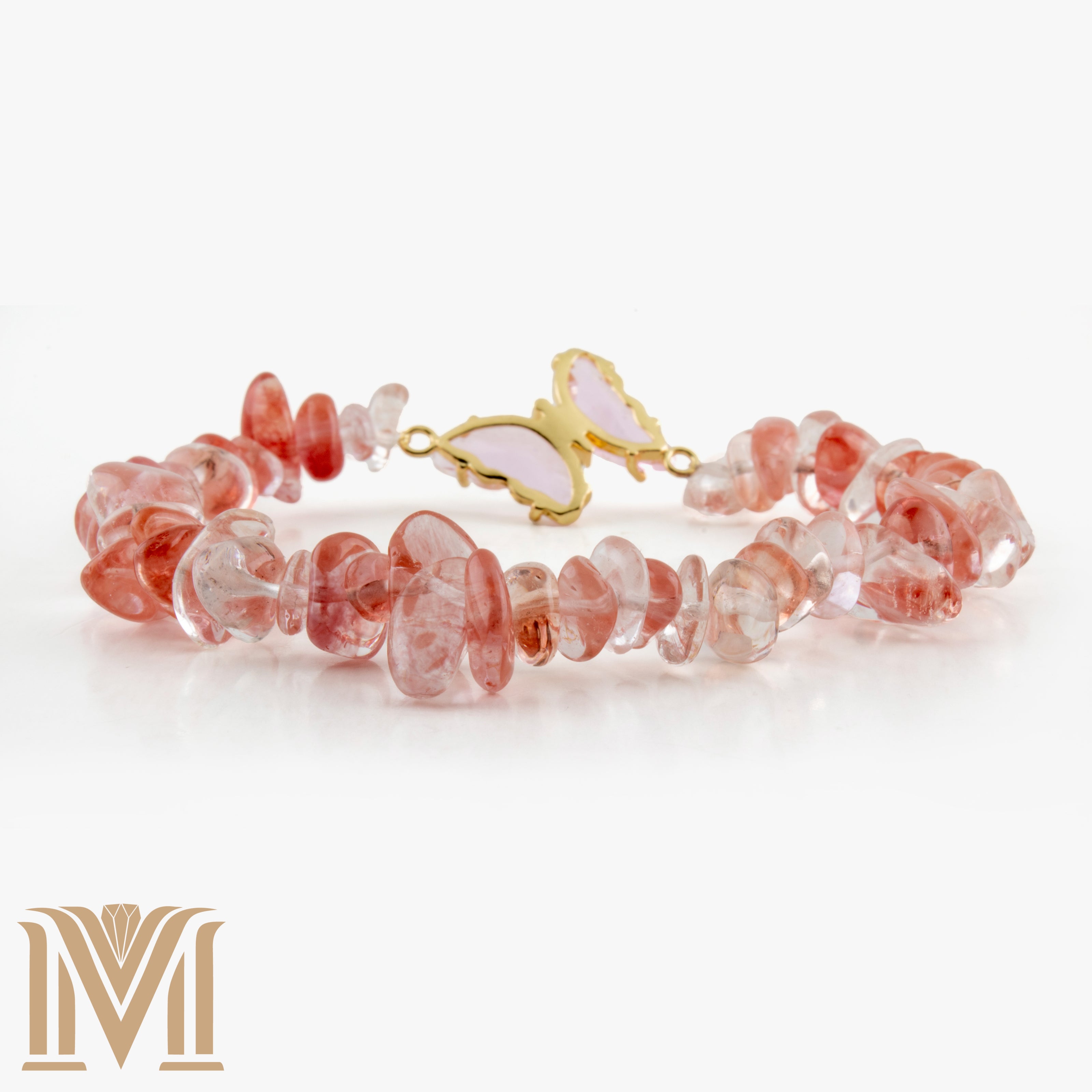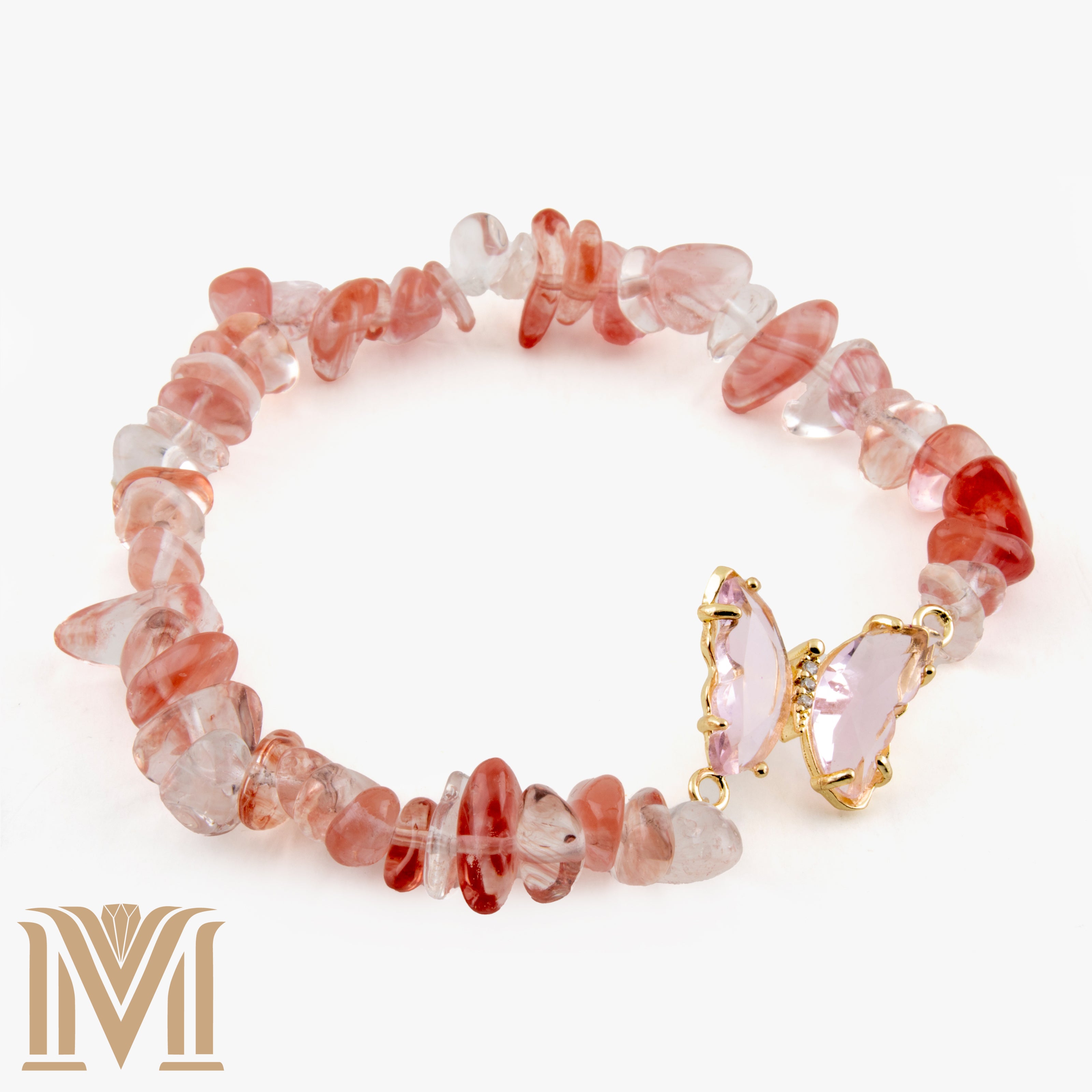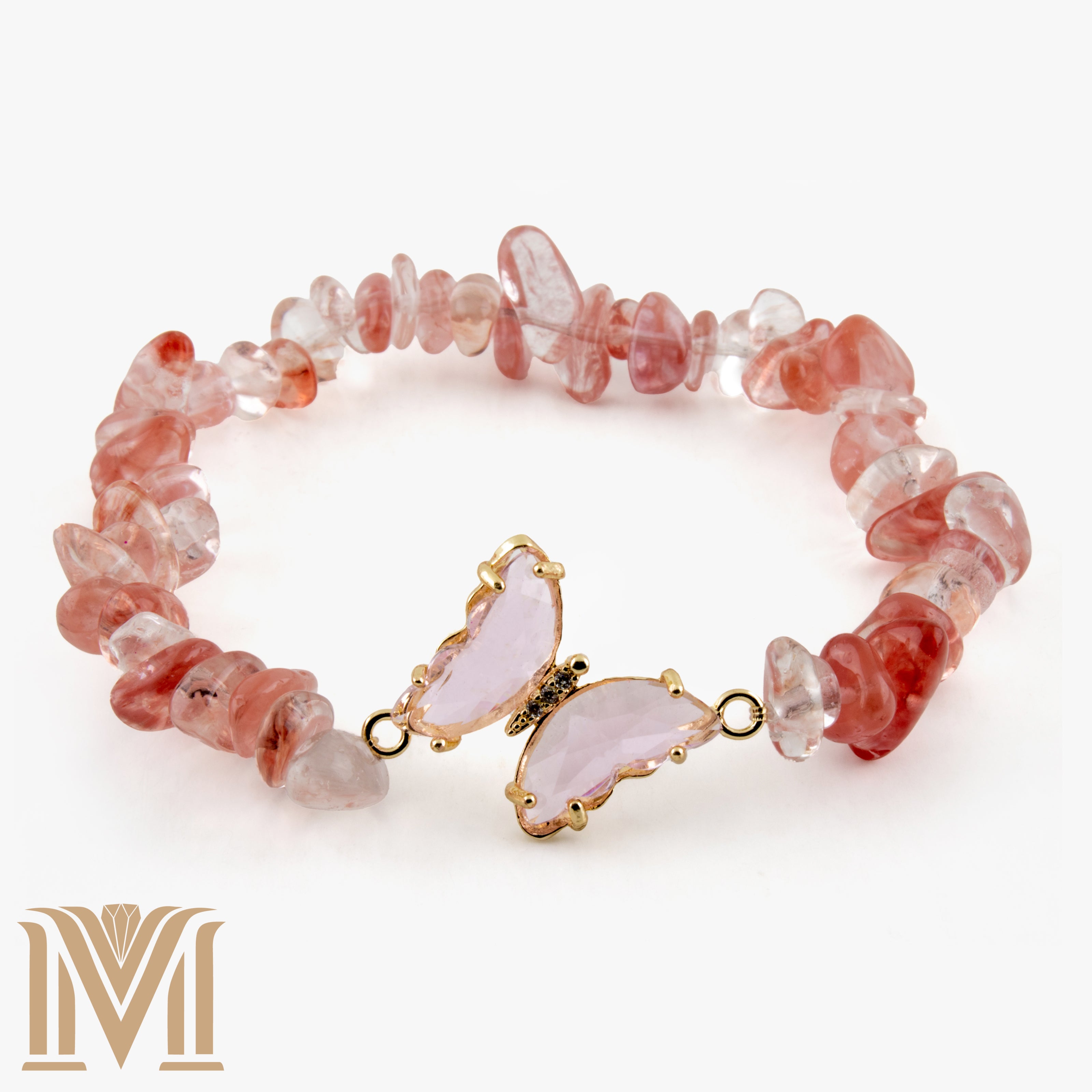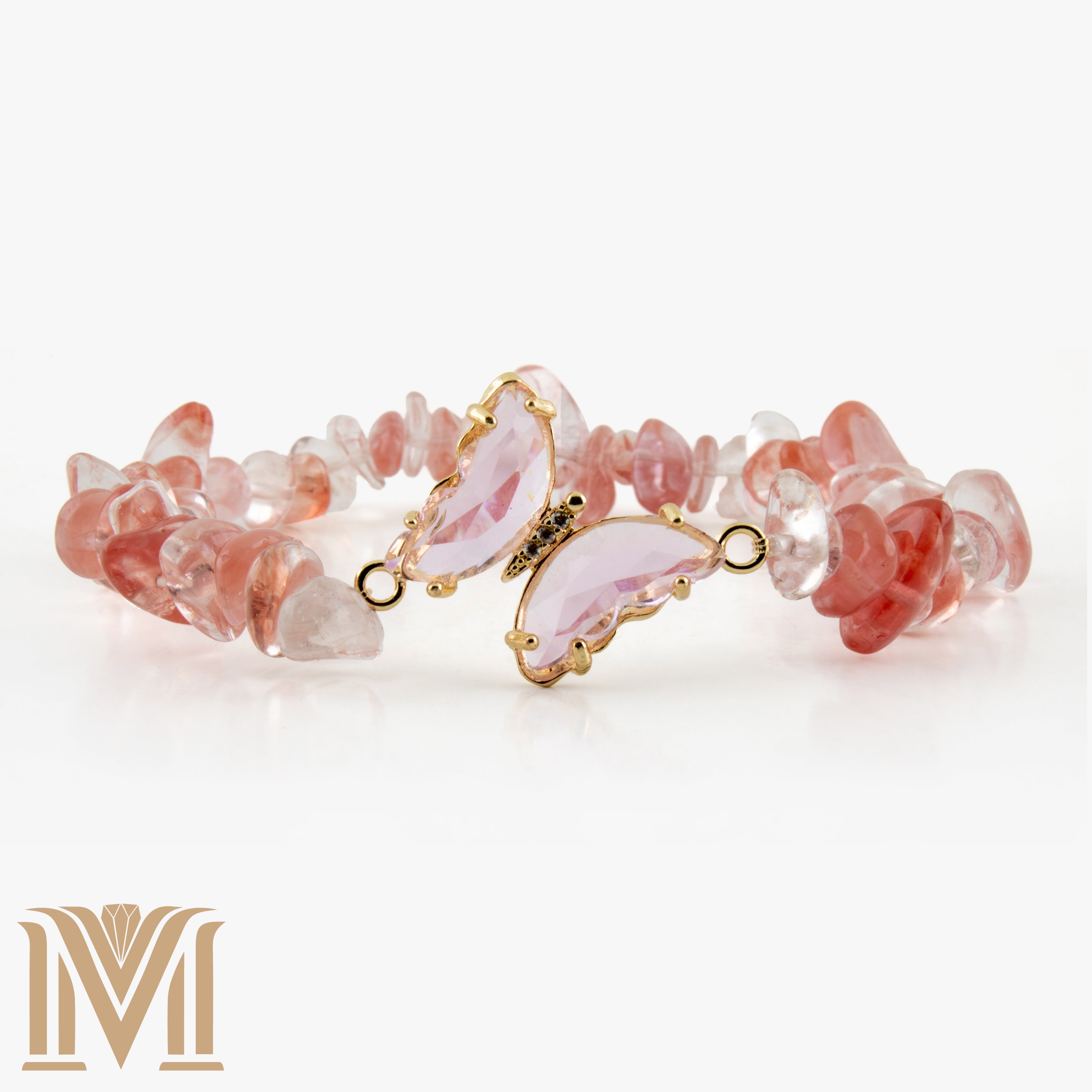 Celebrate graceful elegance with the Rosy Whimsy bracelet — a handcrafted piece that brings together the delicate charm of watermelon quartz chip beads and a shimmering butterfly centerpiece made of rose-tinted glass. Designed with an elastic cord for comfort and flexibility, this bracelet embraces femininity, fluidity, and a touch of playful luxury.